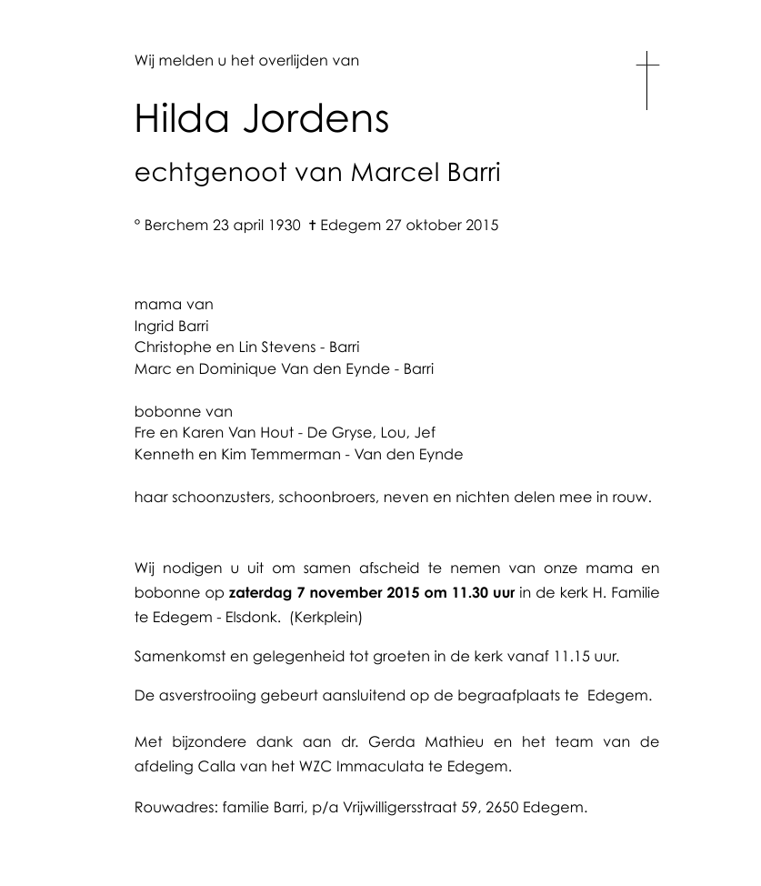 Overleden te Edegem (2650) op dinsdag 27 oktober 2015 op 85-jarige leeftijd