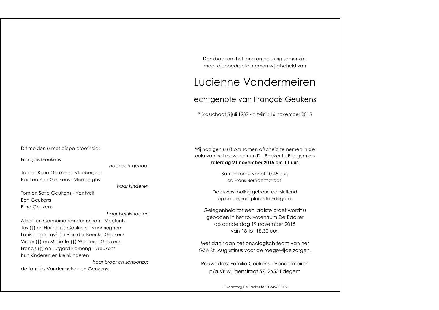Overleden te Wilrijk (Antwerpen) (2610) op maandag 16 november 2015 op 78-jarige leeftijd