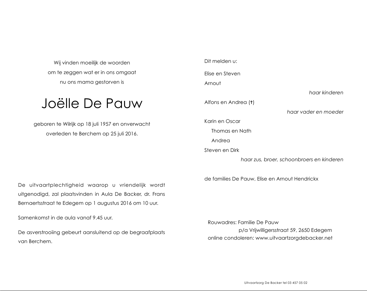 Overleden te Berchem (Antwerpen) (2600) op maandag 25 juli 2016 op 59-jarige leeftijd
