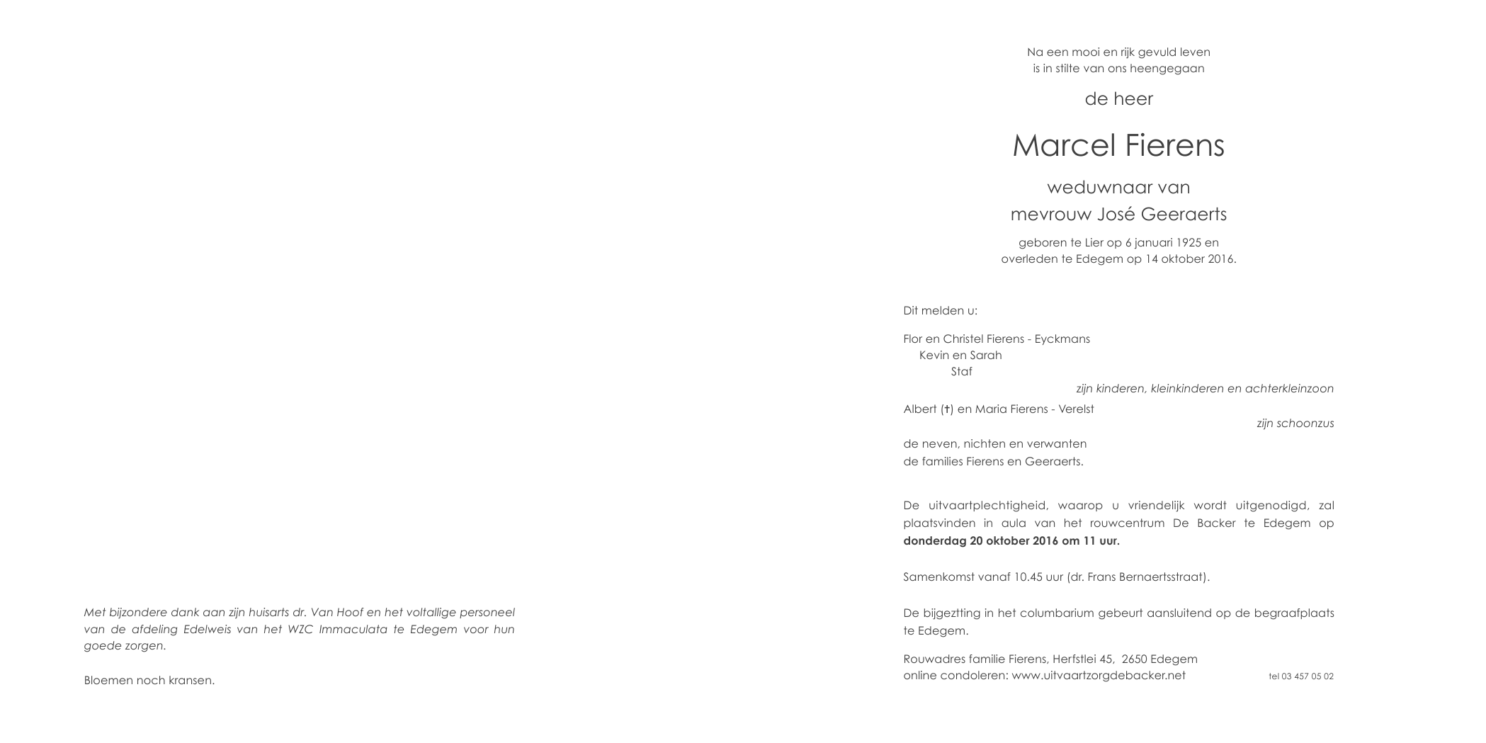 Overleden te Edegem (2650) op zaterdag 15 oktober 2016 op 91-jarige leeftijd