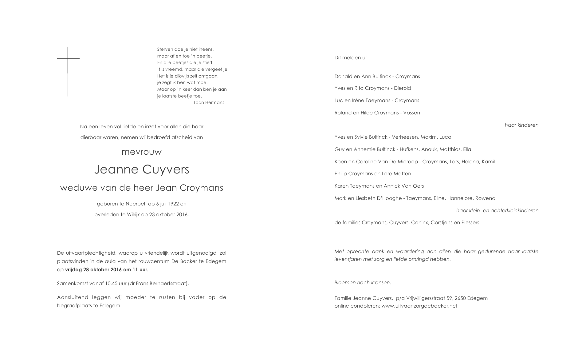 Overleden te Wilrijk (Antwerpen) (2610) op zondag 23 oktober 2016 op 94-jarige leeftijd