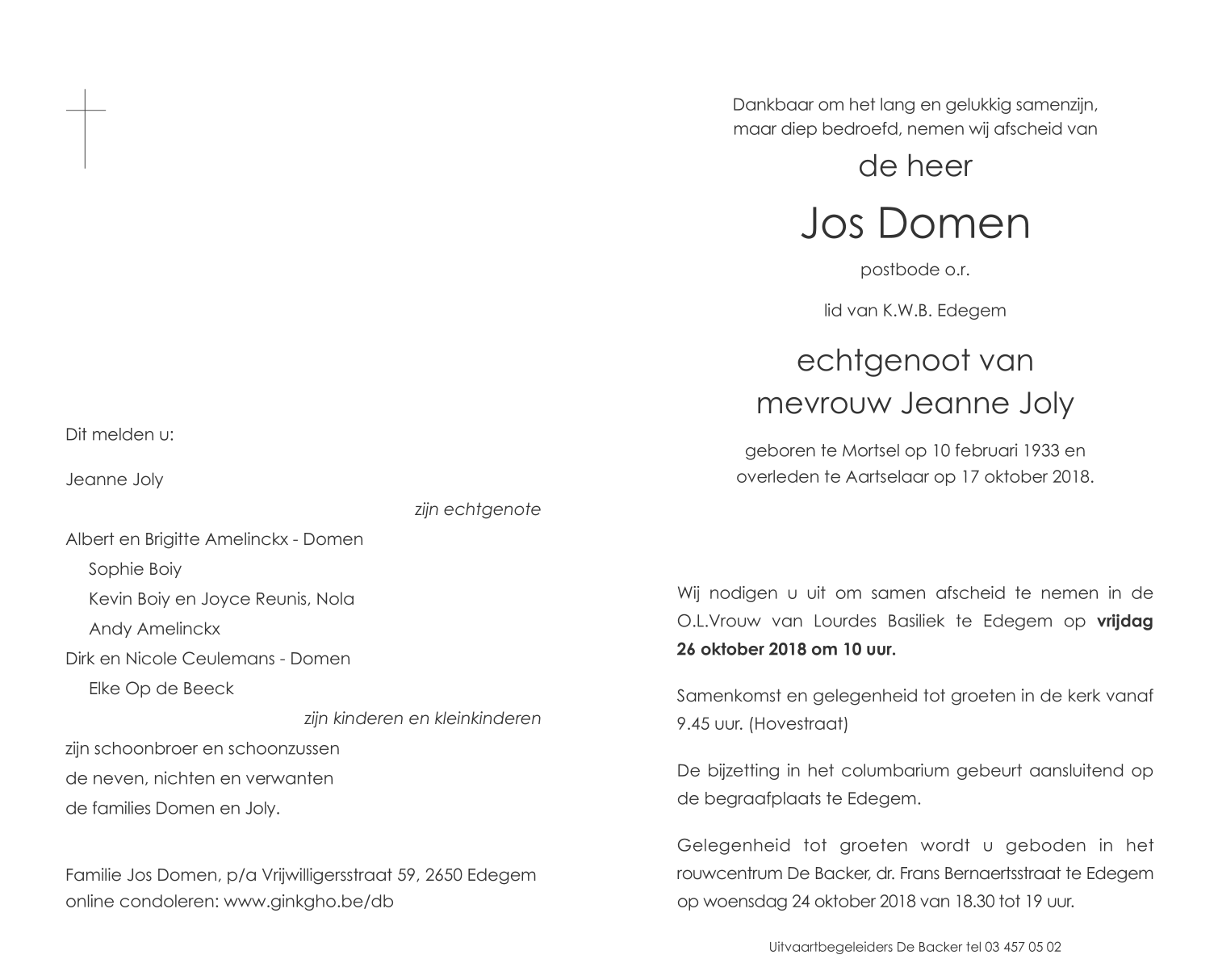 Overleden te Aartselaar (2630) op woensdag 17 oktober 2018 op 85-jarige leeftijd