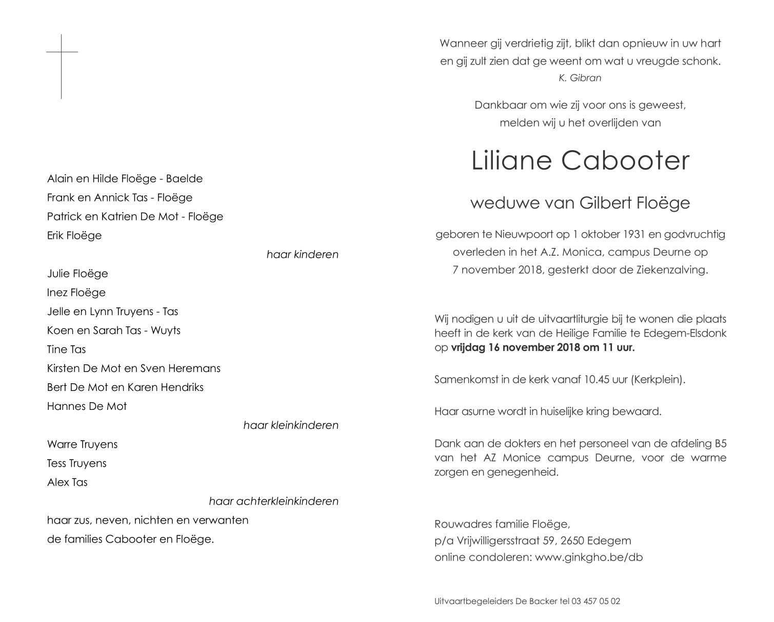 Overleden te Deurne (Antwerpen) (2100) op woensdag 7 november 2018 op 87-jarige leeftijd