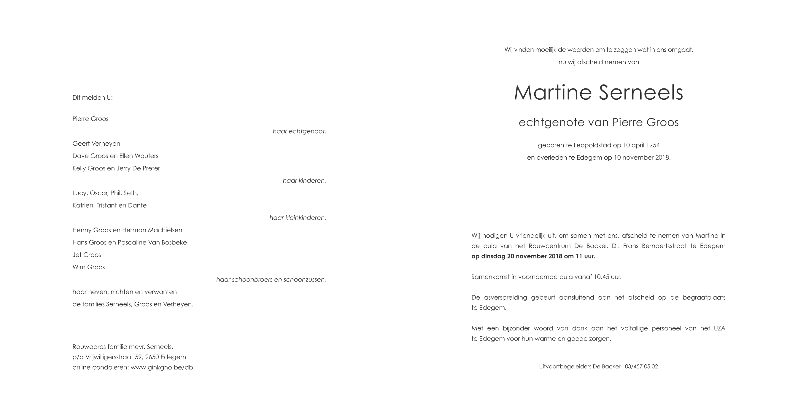 Overleden te Edegem (2650) op zaterdag 10 november 2018 op 64-jarige leeftijd
