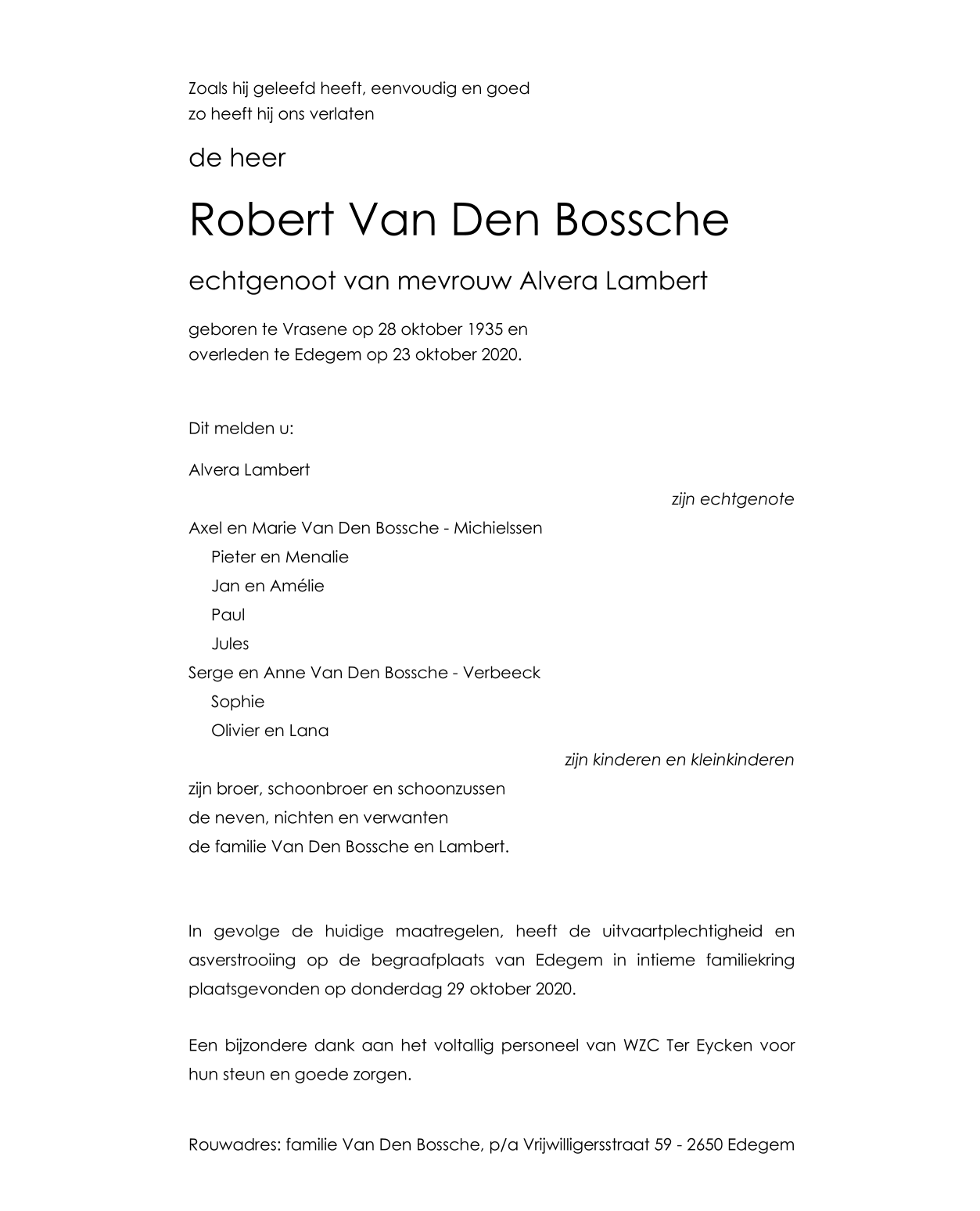 Overleden te Edegem (2650) op vrijdag 23 oktober 2020 op 84-jarige leeftijd