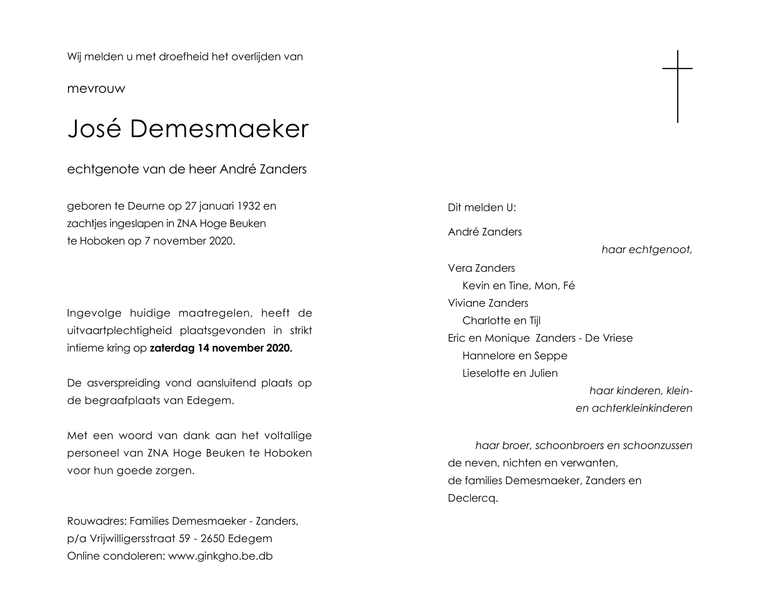 Overleden te Hoboken (Antwerpen) (2660) op zaterdag 7 november 2020 op 88-jarige leeftijd