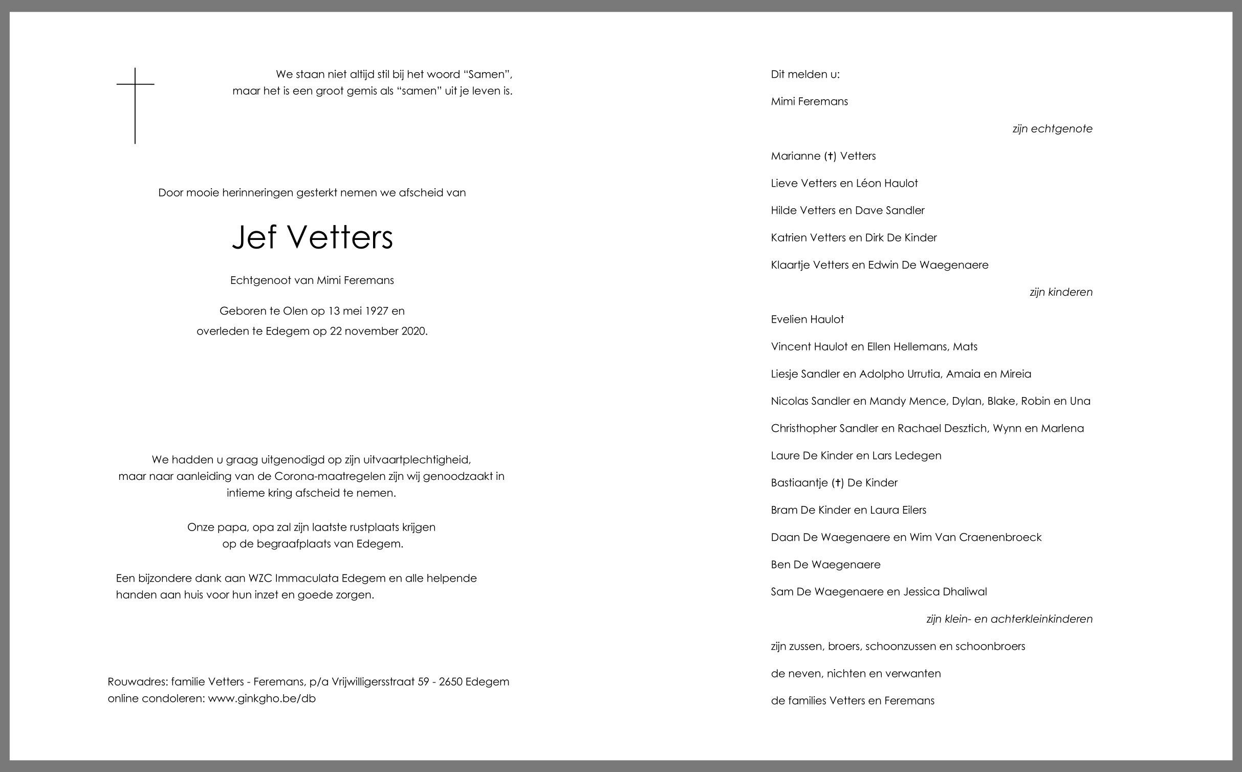 Overleden te Edegem (2650) op zondag 22 november 2020 op 93-jarige leeftijd