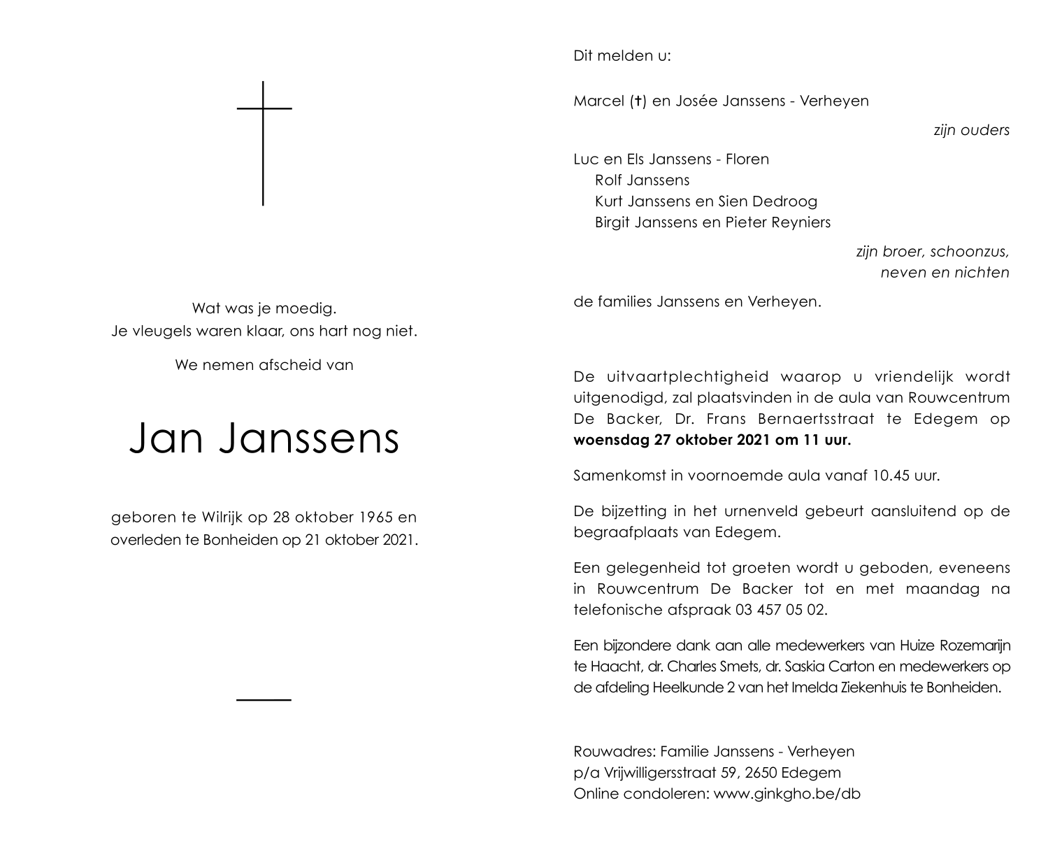 Overleden te Bonheiden (2820) op donderdag 21 oktober 2021 op 55-jarige leeftijd