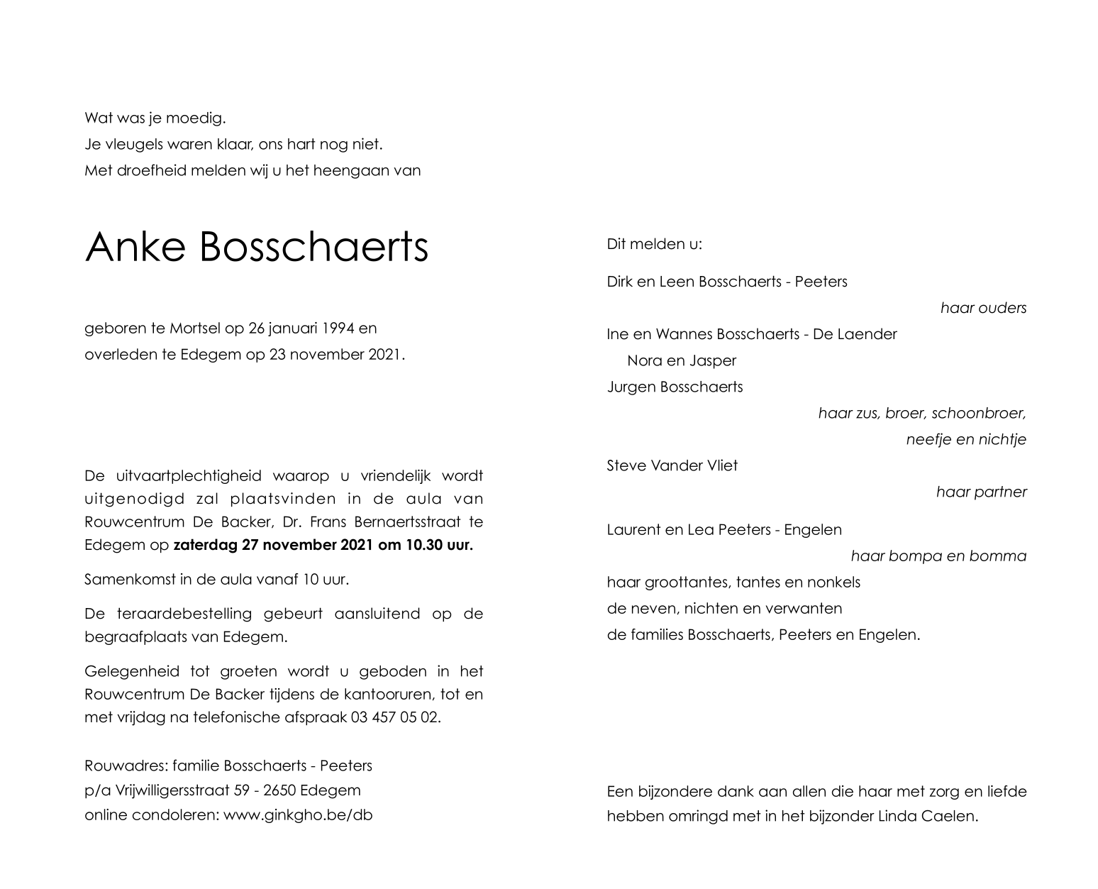 Overleden te Edegem (2650) op dinsdag 23 november 2021 op 27-jarige leeftijd