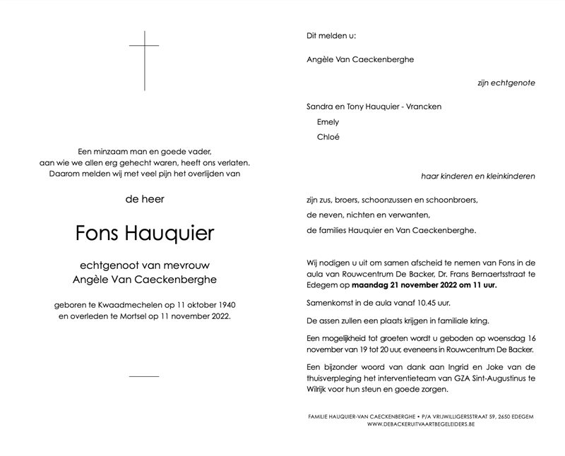 Overleden te Mortsel (2640) op vrijdag 11 november 2022 op 82-jarige leeftijd