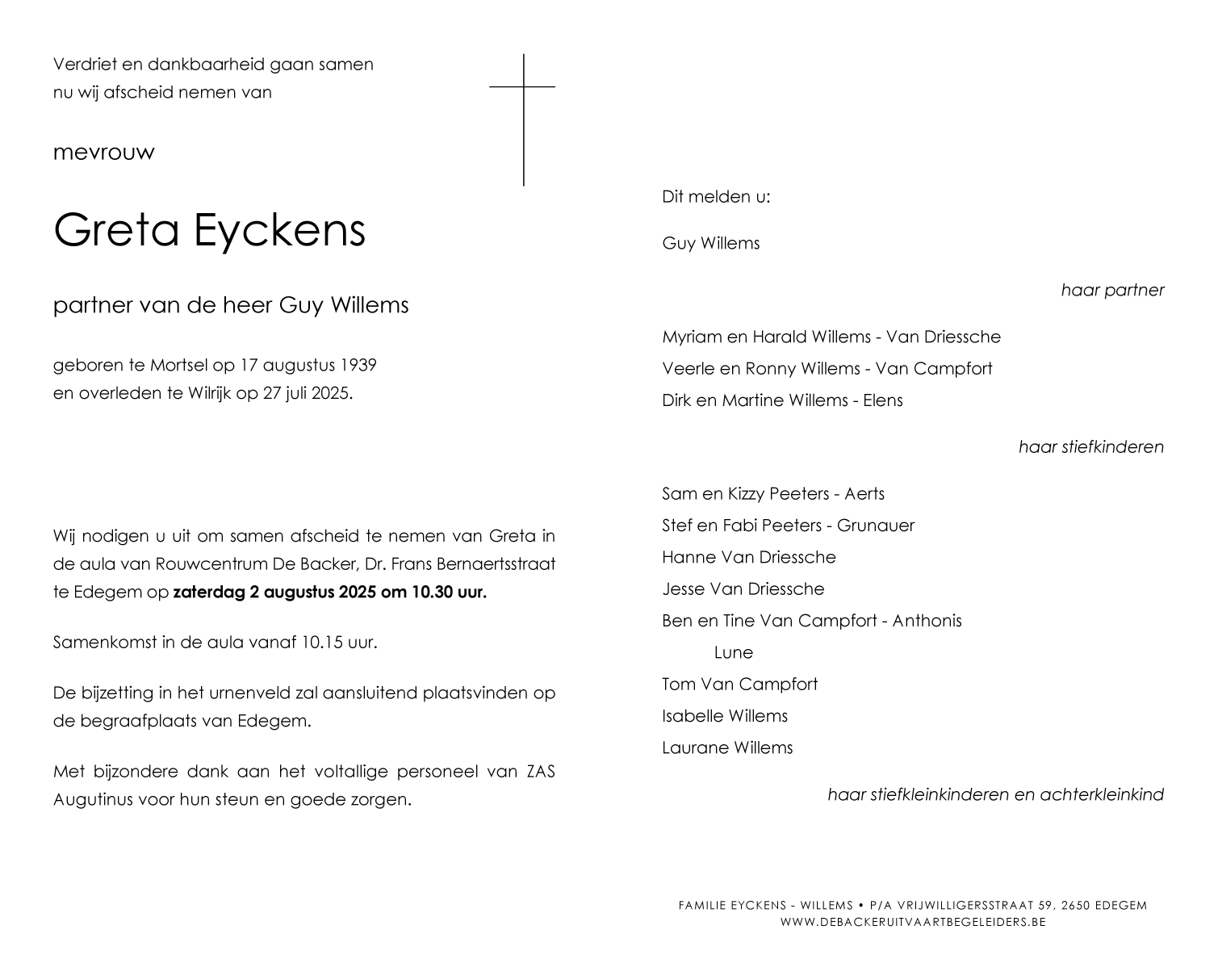 Overleden te Wilrijk (Antwerpen) (2610) op zondag 27 juli 2025 op 85-jarige leeftijd