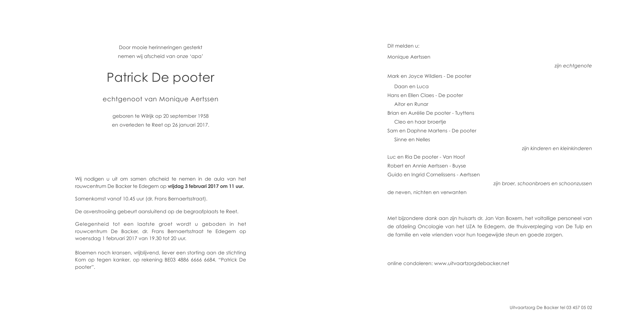 Overleden te Reet (2840) op donderdag 26 januari 2017 op 58-jarige leeftijd