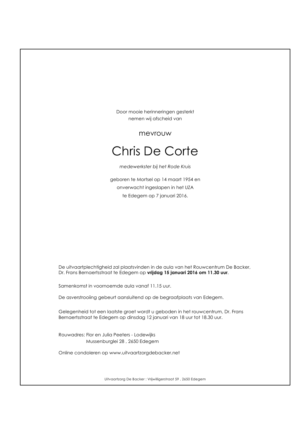 Overleden te Edegem (2650) op donderdag 7 januari 2016 op 61-jarige leeftijd