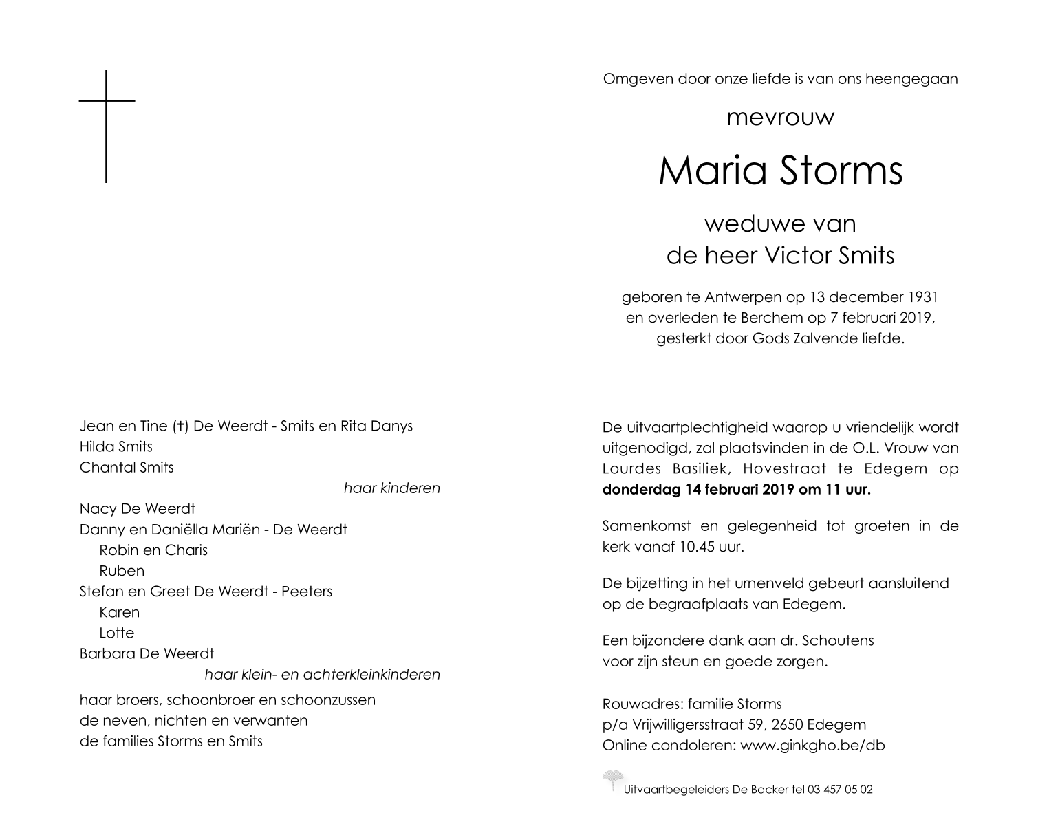 Overleden te Berchem (Antwerpen) (2600) op donderdag 7 februari 2019 op 87-jarige leeftijd