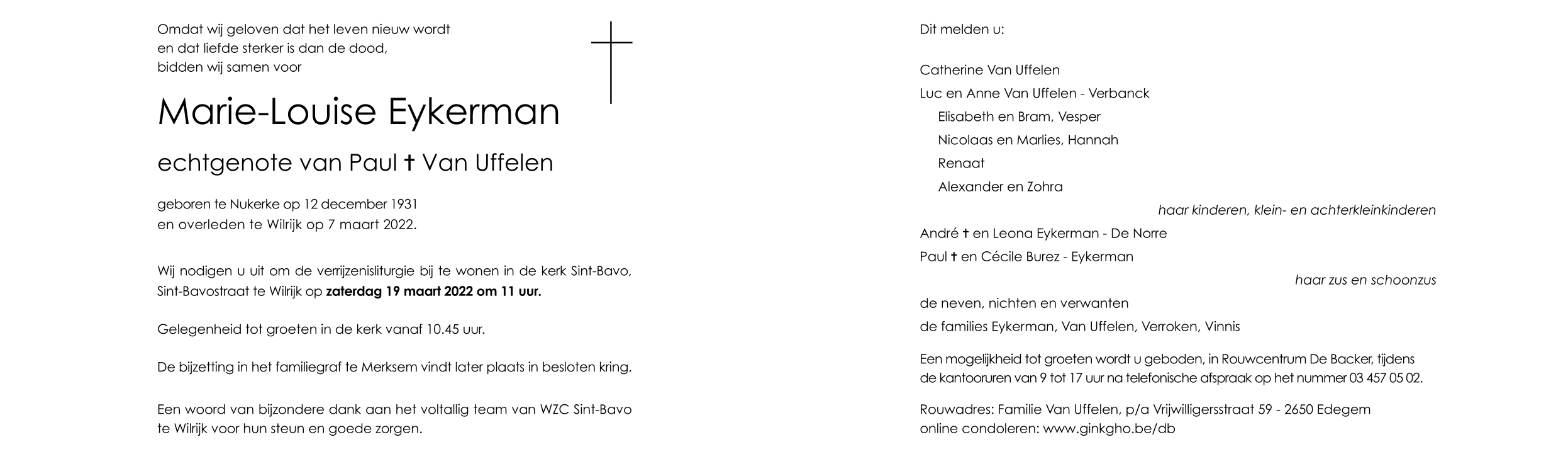 Overlijdensbericht Marie-Louise Eykerman