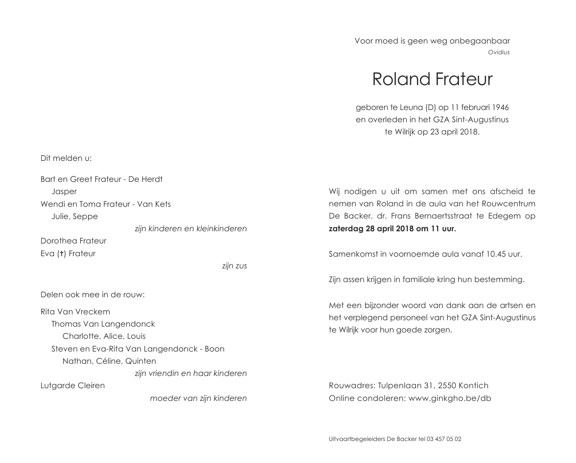 Overleden te Wilrijk (Antwerpen) (2610) op maandag 23 april 2018 op 72-jarige leeftijd
