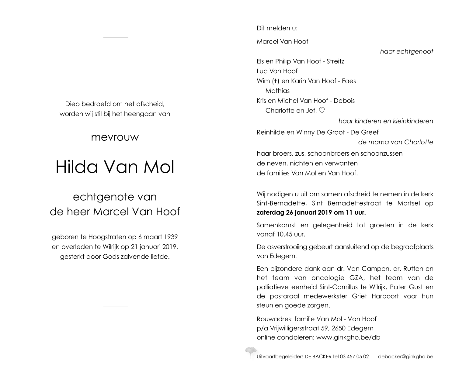 Overleden te Wilrijk (Antwerpen) (2610) op maandag 21 januari 2019 op 79-jarige leeftijd
