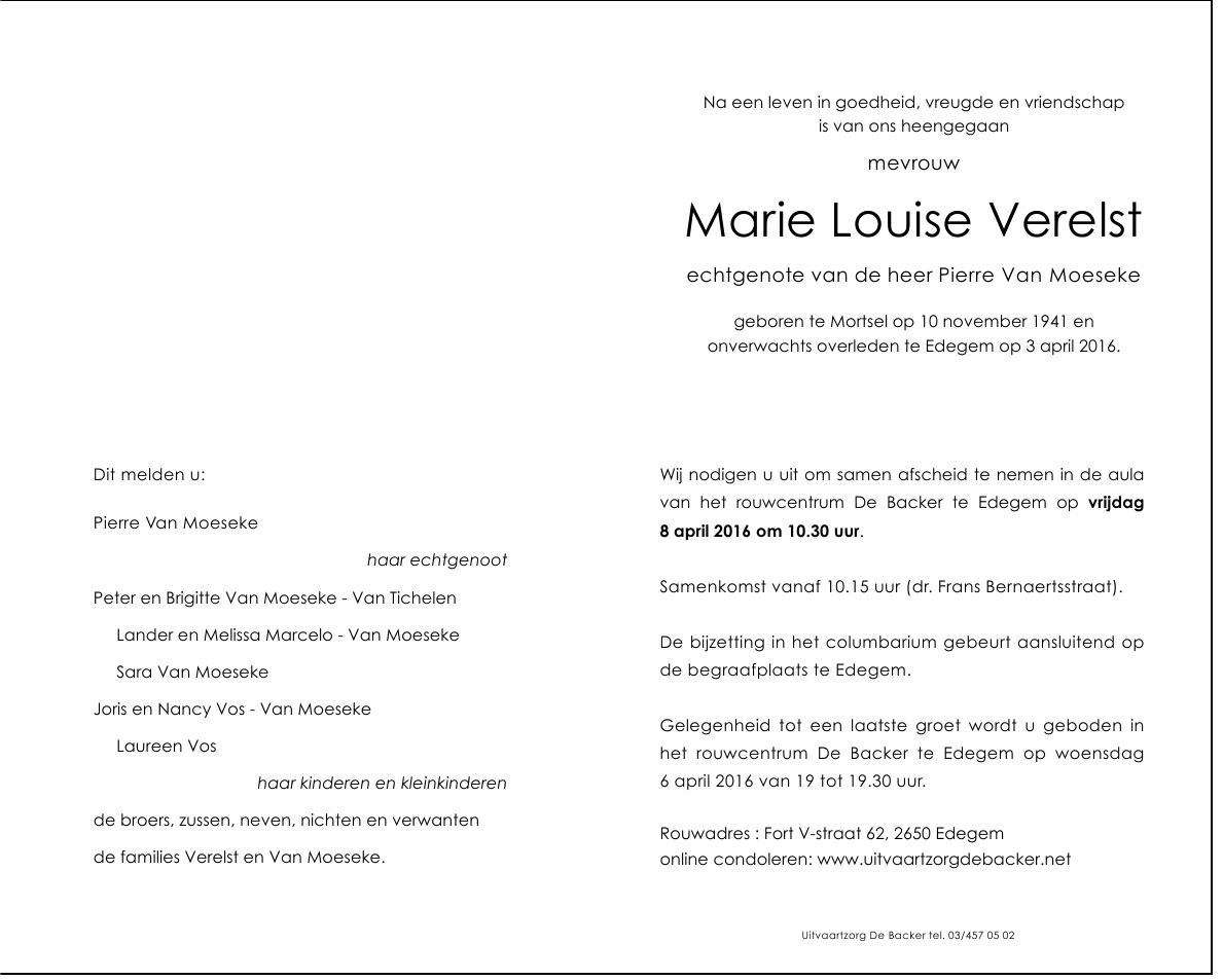 Overleden te Edegem (2650) op zondag 3 april 2016 op 74-jarige leeftijd