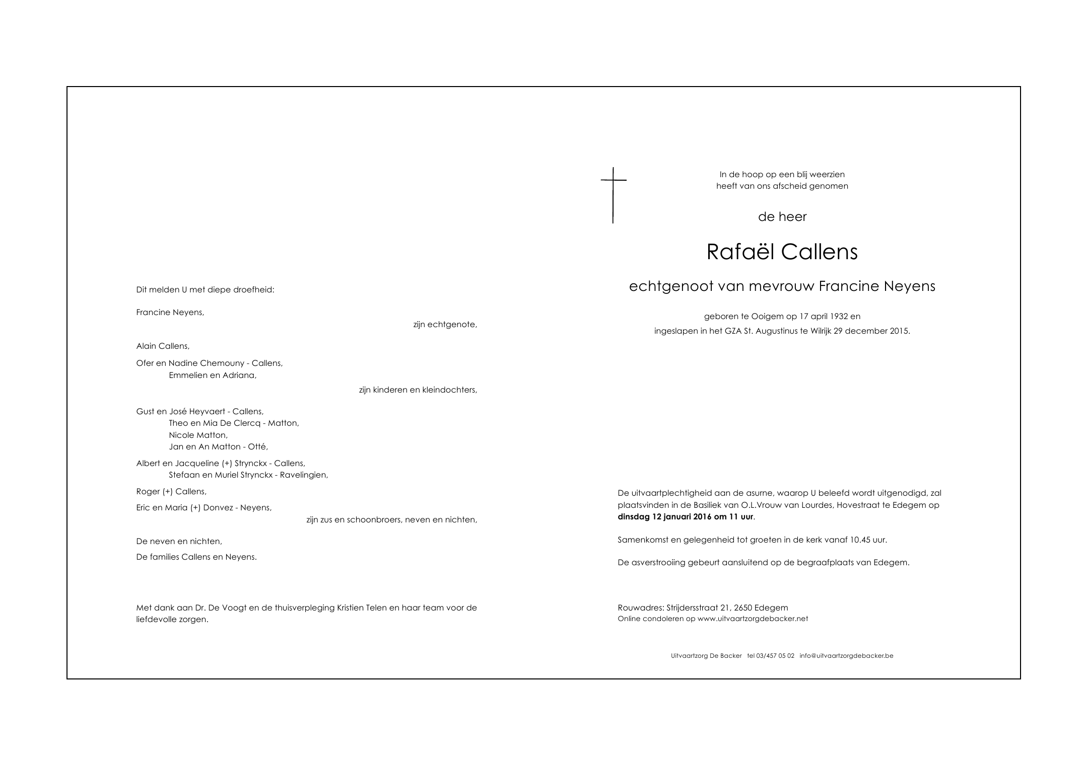 Overleden te Wilrijk (Antwerpen) (2610) op dinsdag 29 december 2015 op 83-jarige leeftijd