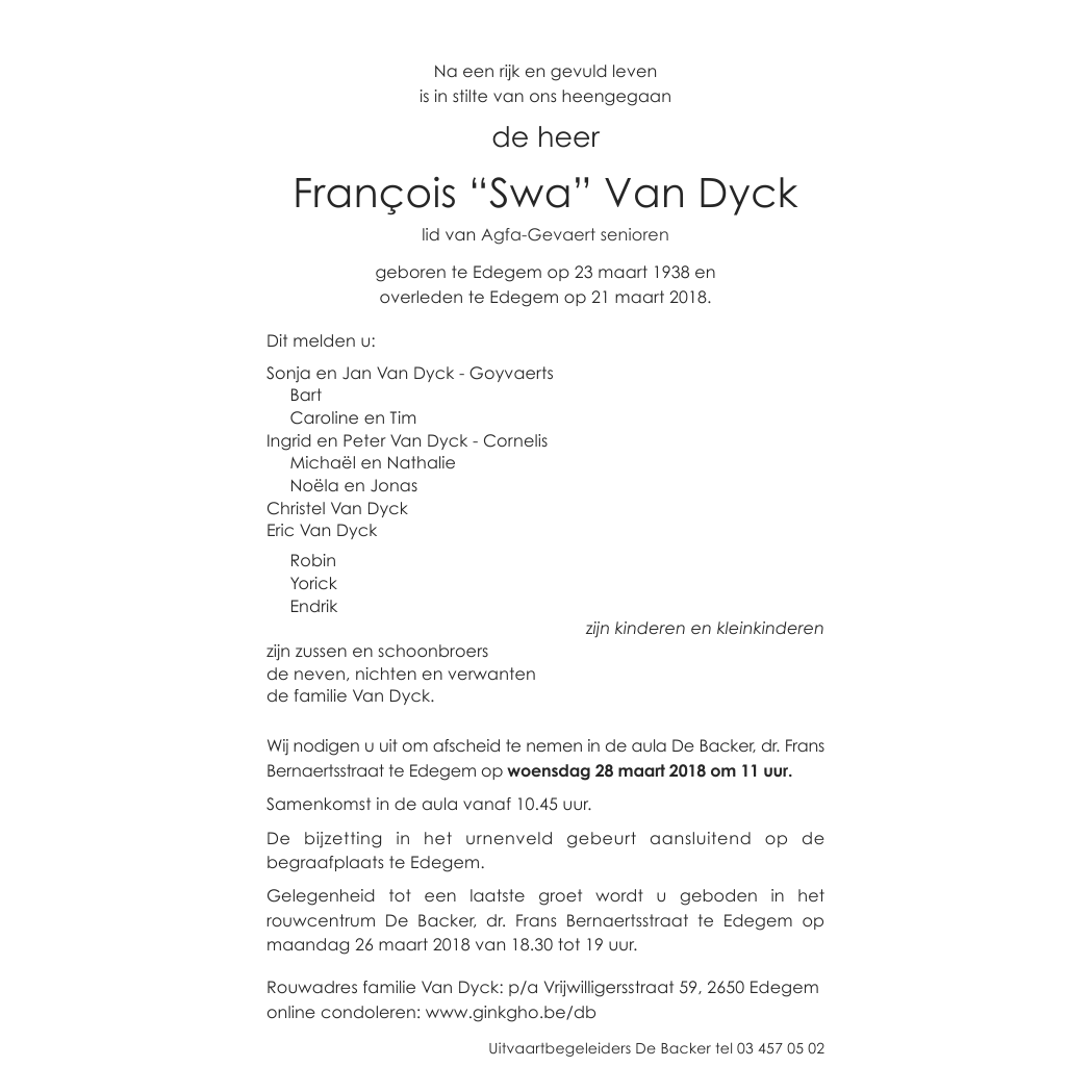 Overleden te Edegem (2650) op woensdag 21 maart 2018 op 79-jarige leeftijd