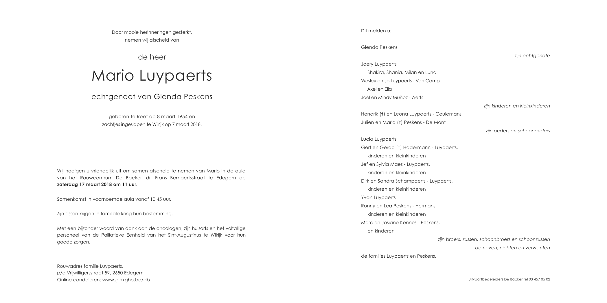 Overleden te Wilrijk (Antwerpen) (2610) op woensdag 7 maart 2018 op 63-jarige leeftijd