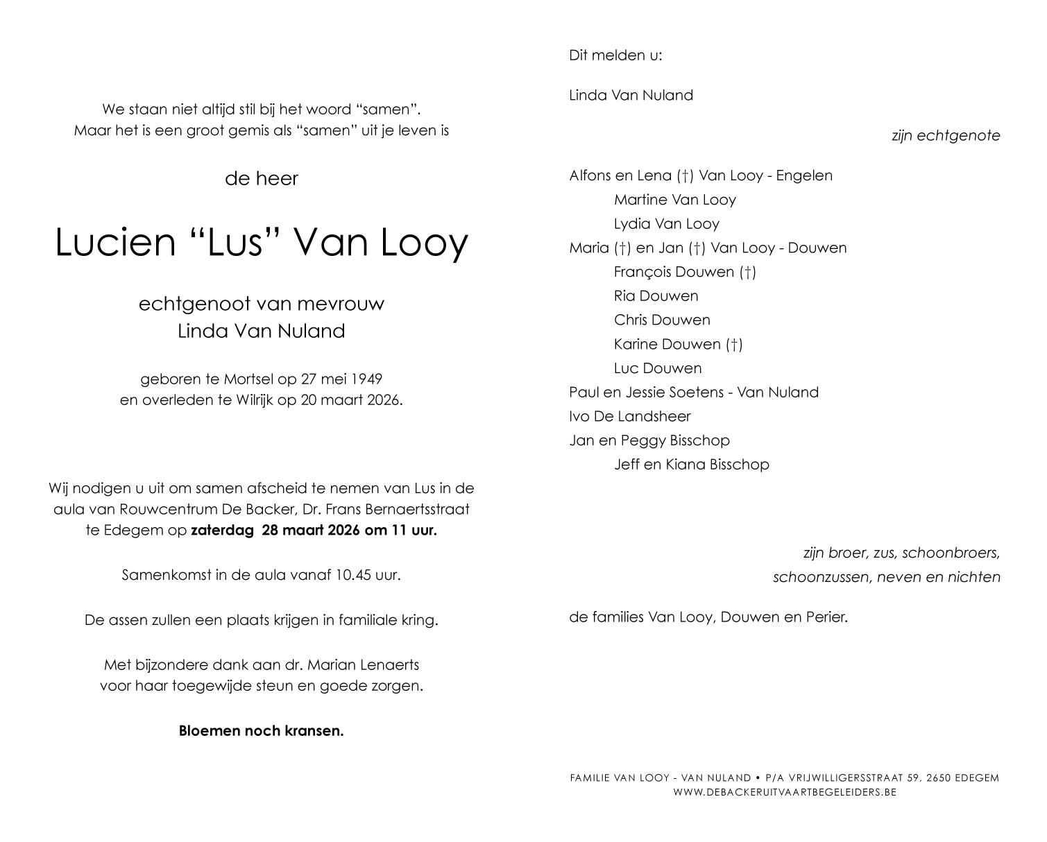 Overleden te Wilrijk (Antwerpen) (2610) op vrijdag 20 maart 2026 op 76-jarige leeftijd