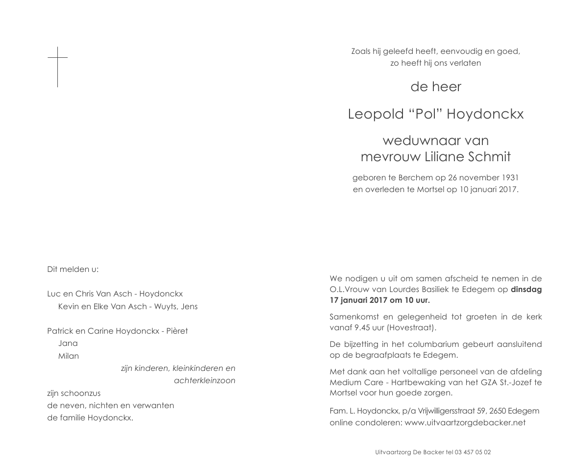 Overleden te Mortsel (2640) op dinsdag 10 januari 2017 op 85-jarige leeftijd