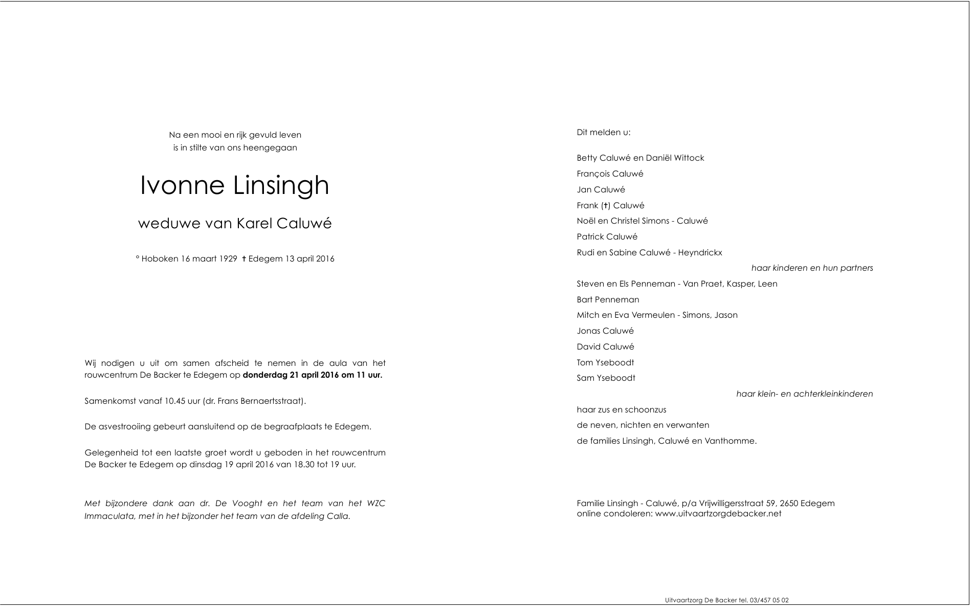 Overleden te Edegem (2650) op woensdag 13 april 2016 op 87-jarige leeftijd