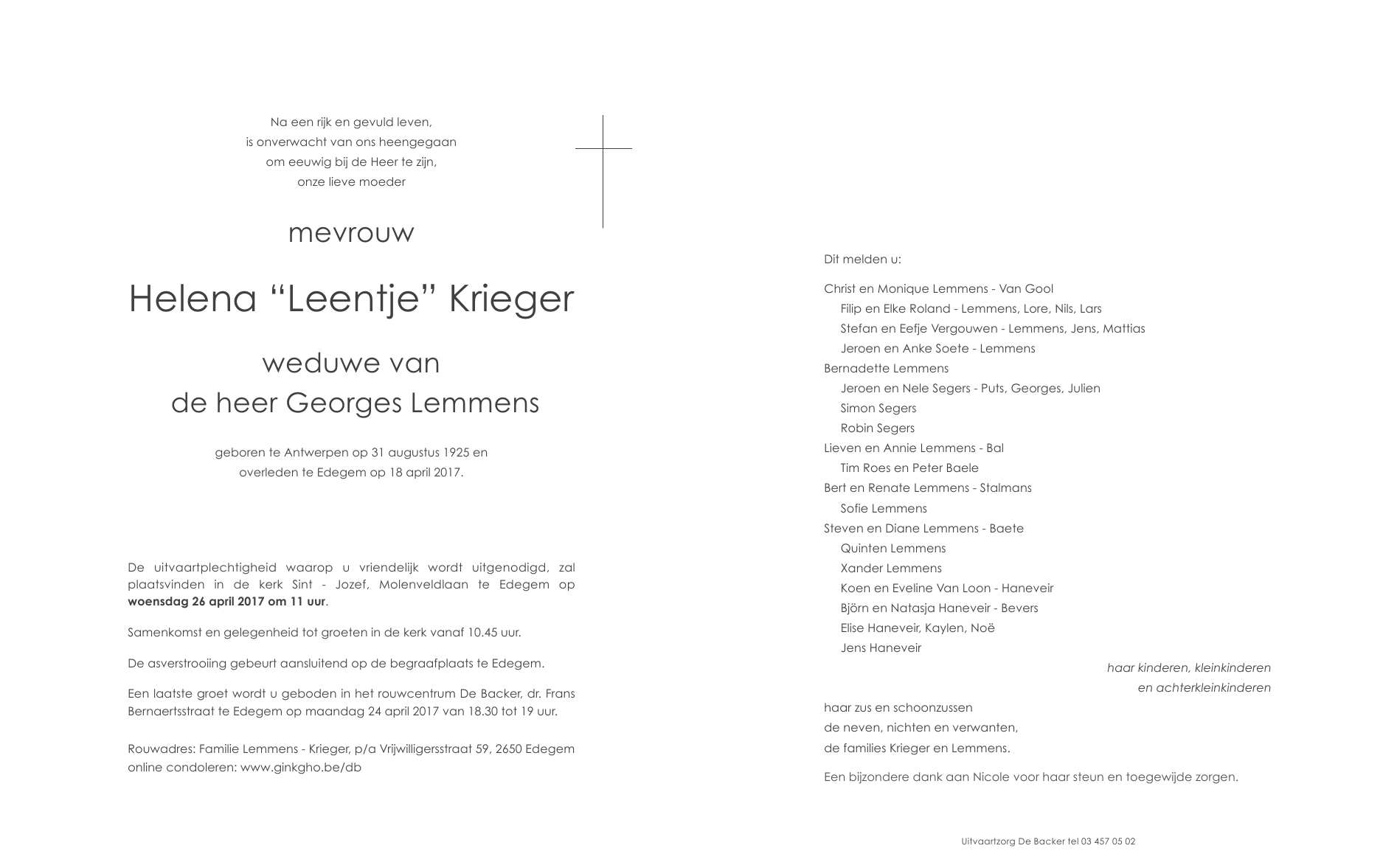 Overleden te Edegem (2650) op dinsdag 18 april 2017 op 91-jarige leeftijd