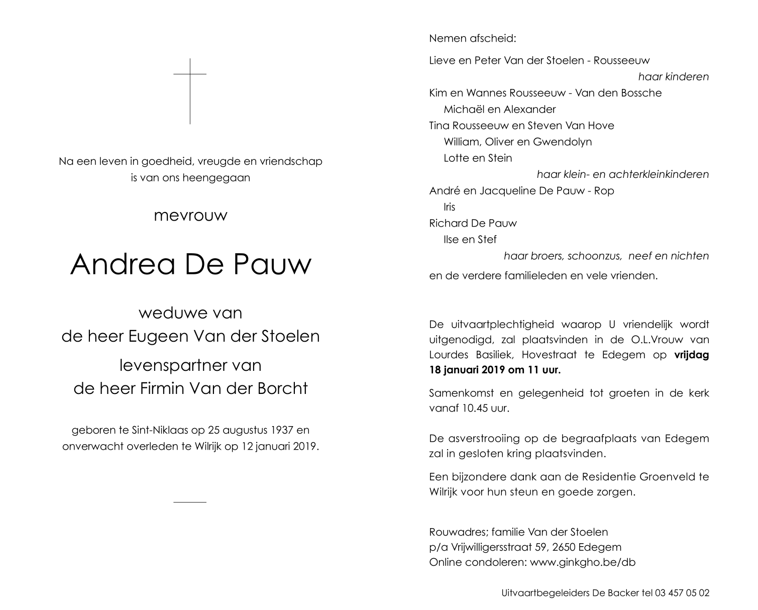 Overleden te Wilrijk (Antwerpen) (2610) op zaterdag 12 januari 2019 op 81-jarige leeftijd