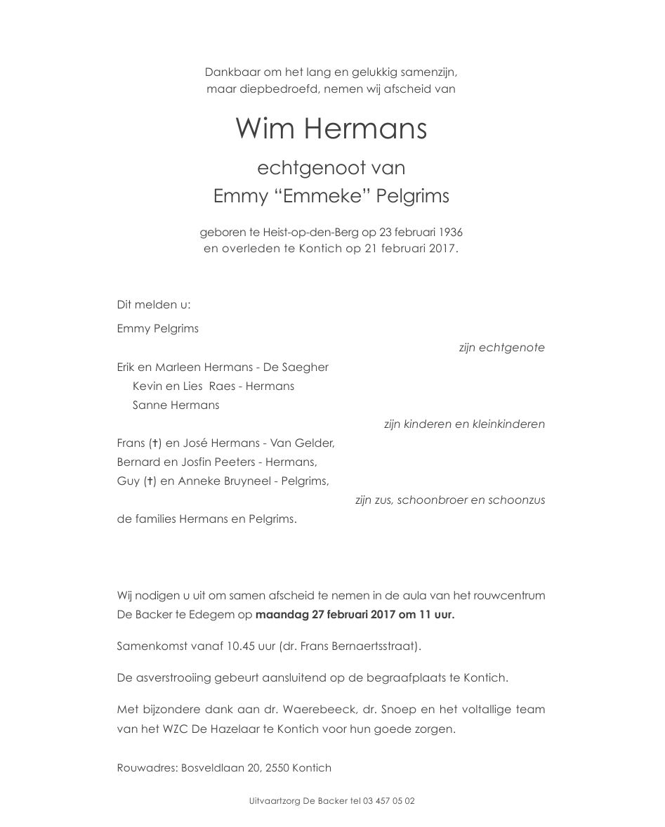 Overleden te Kontich (2550) op dinsdag 21 februari 2017 op 80-jarige leeftijd