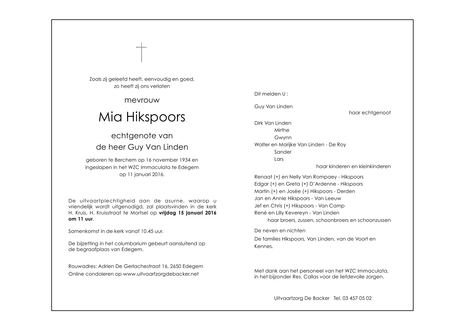 Overleden te Edegem (2650) op maandag 11 januari 2016 op 81-jarige leeftijd