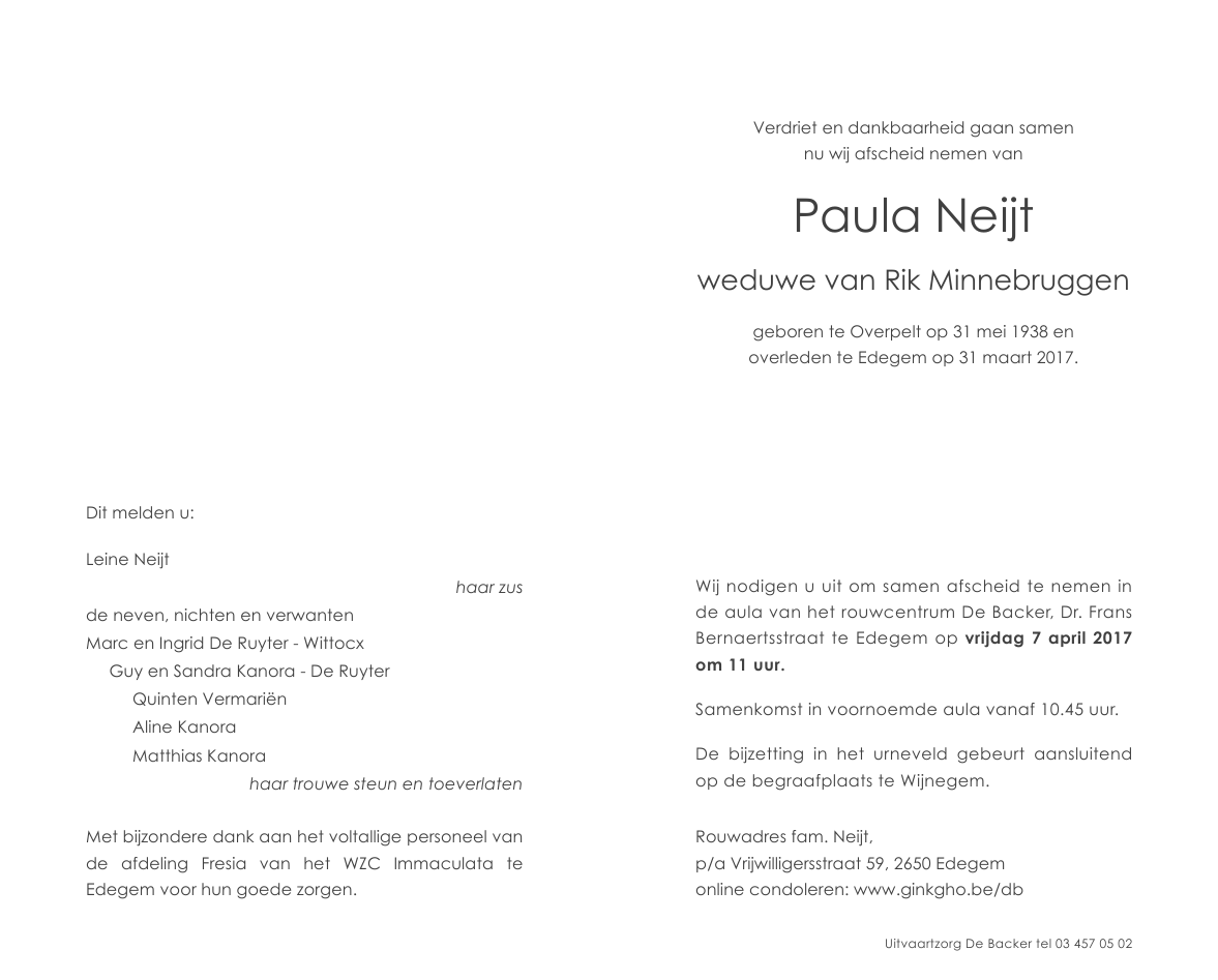 Weduwe van de heer Rik Minnebruggen