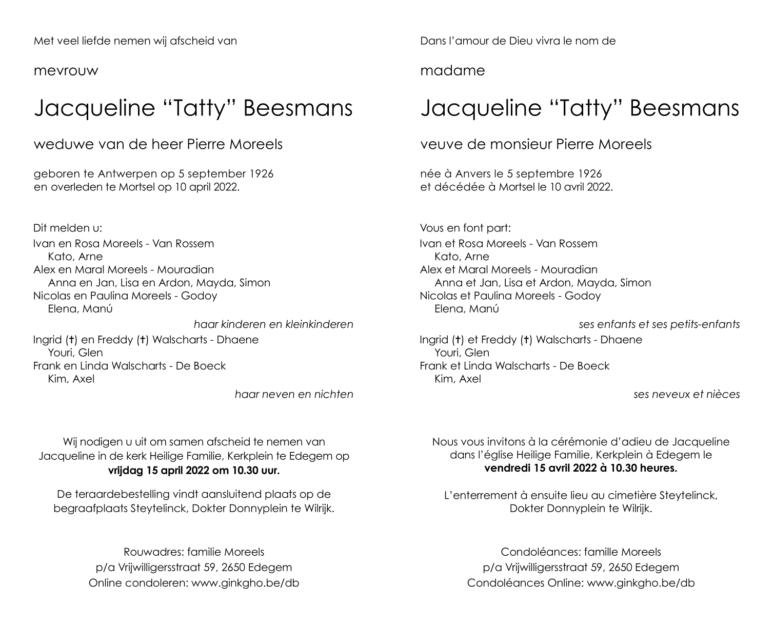 Overleden te Mortsel (2640) op zondag 10 april 2022 op 95-jarige leeftijd