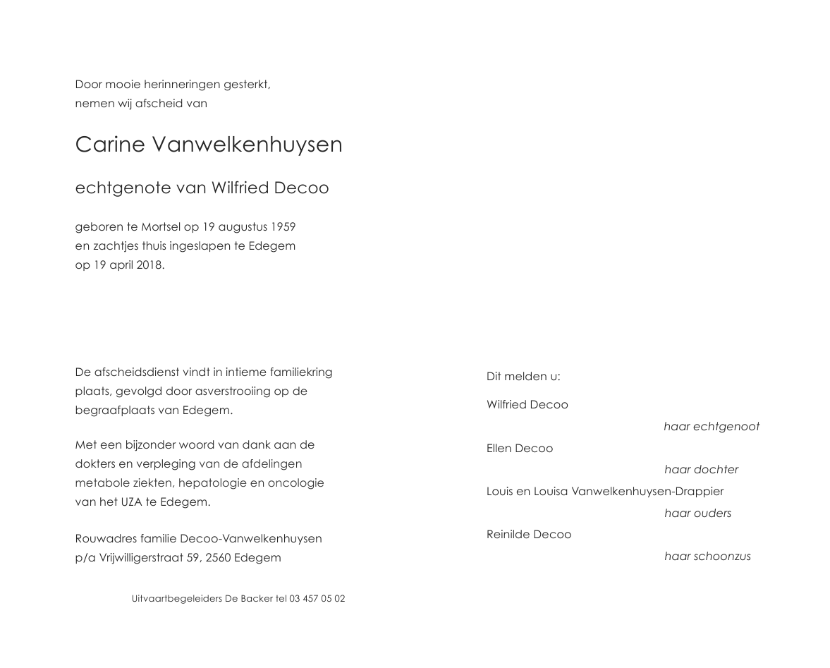 Overleden te Edegem (2650) op donderdag 19 april 2018 op 58-jarige leeftijd