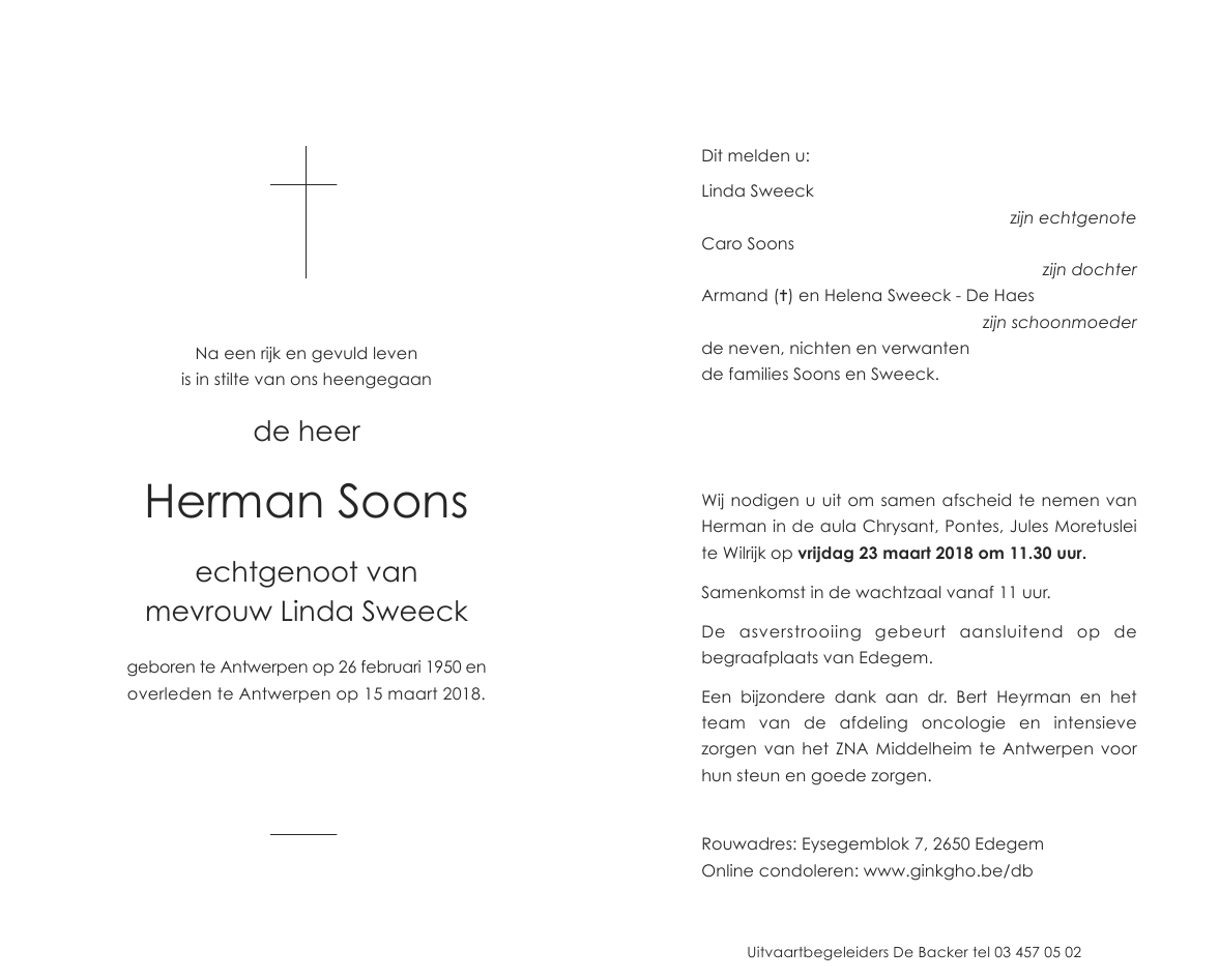 Overleden te Antwerpen (2020) op donderdag 15 maart 2018 op 68-jarige leeftijd