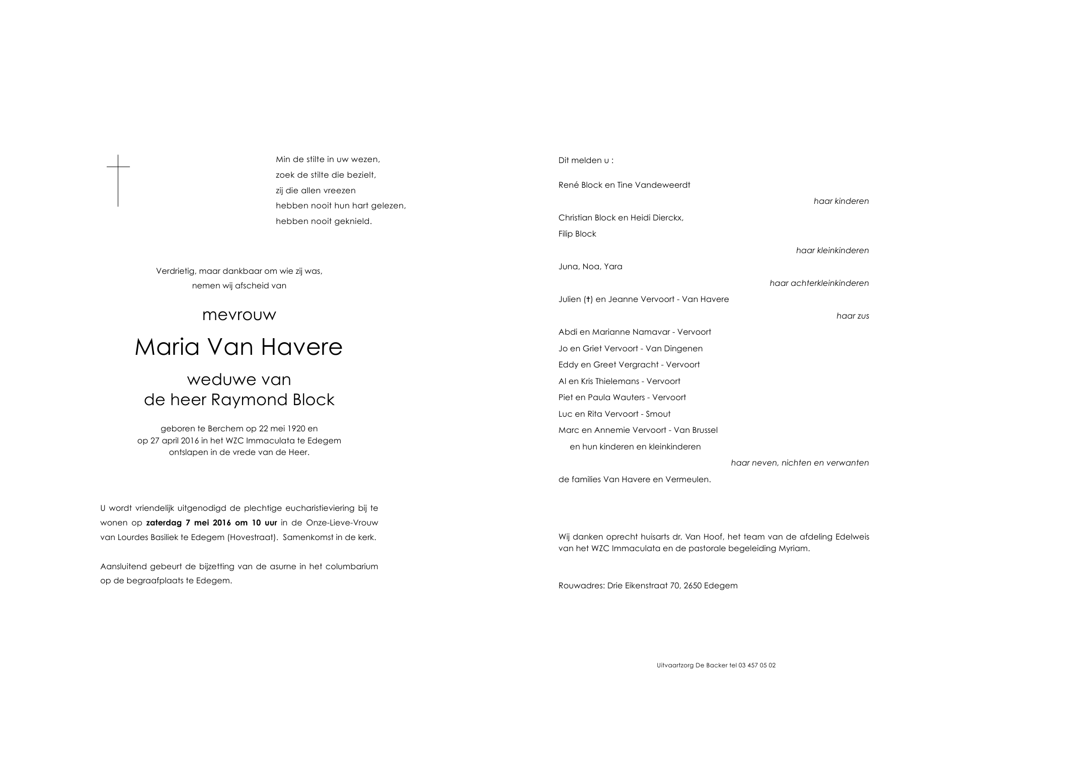 Overleden te Edegem (2650) op woensdag 27 april 2016 op 95-jarige leeftijd