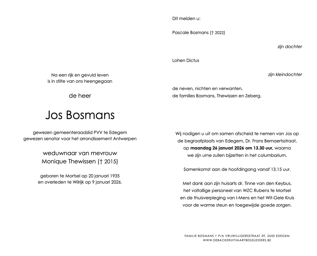 Overleden te Wilrijk (Antwerpen) (2610) op vrijdag 9 januari 2026 op 90-jarige leeftijd