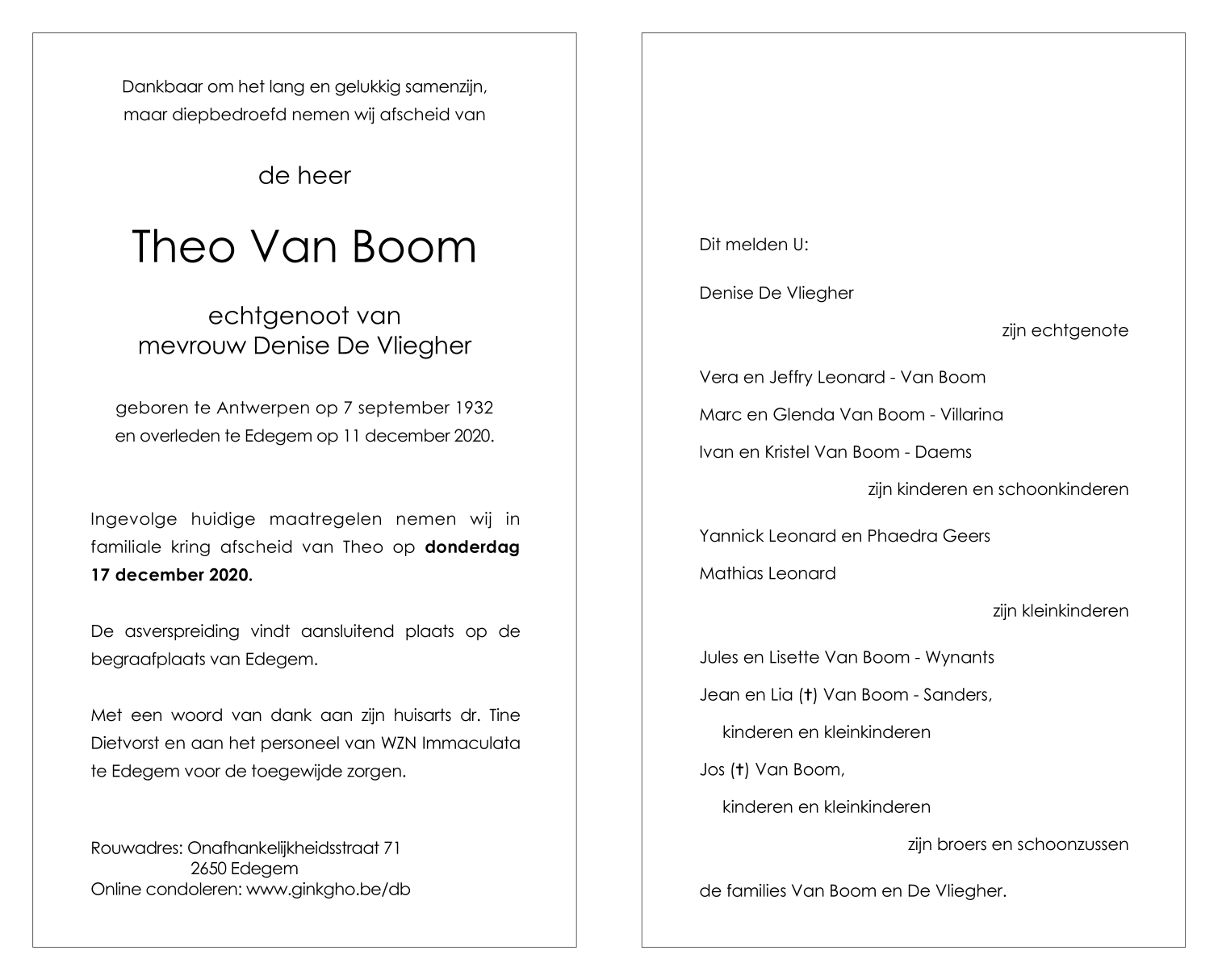 Overleden te Edegem (2650) op vrijdag 11 december 2020 op 88-jarige leeftijd