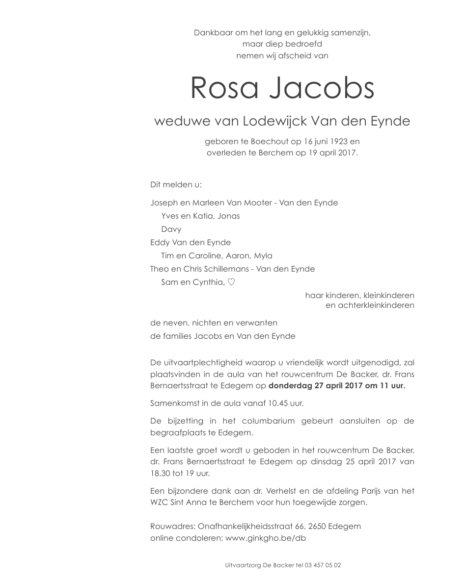 Overleden te Berchem (Antwerpen) (2600) op woensdag 19 april 2017 op 93-jarige leeftijd
