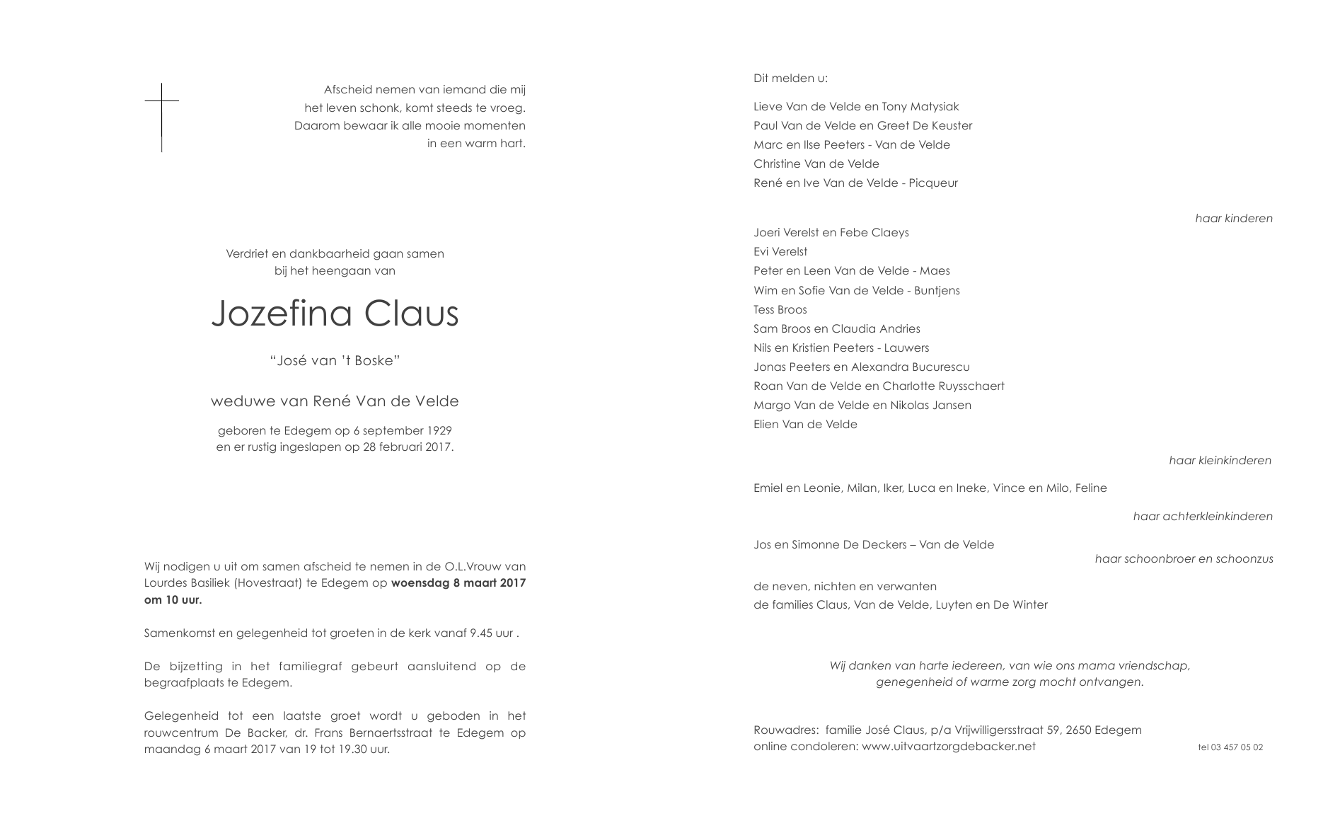 Overleden te Edegem (2650) op dinsdag 28 februari 2017 op 87-jarige leeftijd