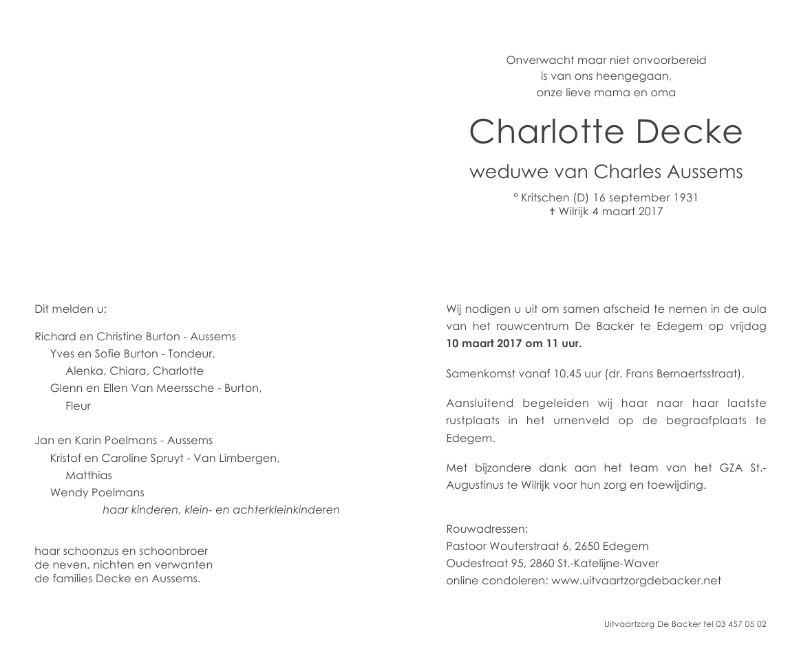 Overleden te Wilrijk (Antwerpen) (2610) op zaterdag 4 maart 2017 op 85-jarige leeftijd