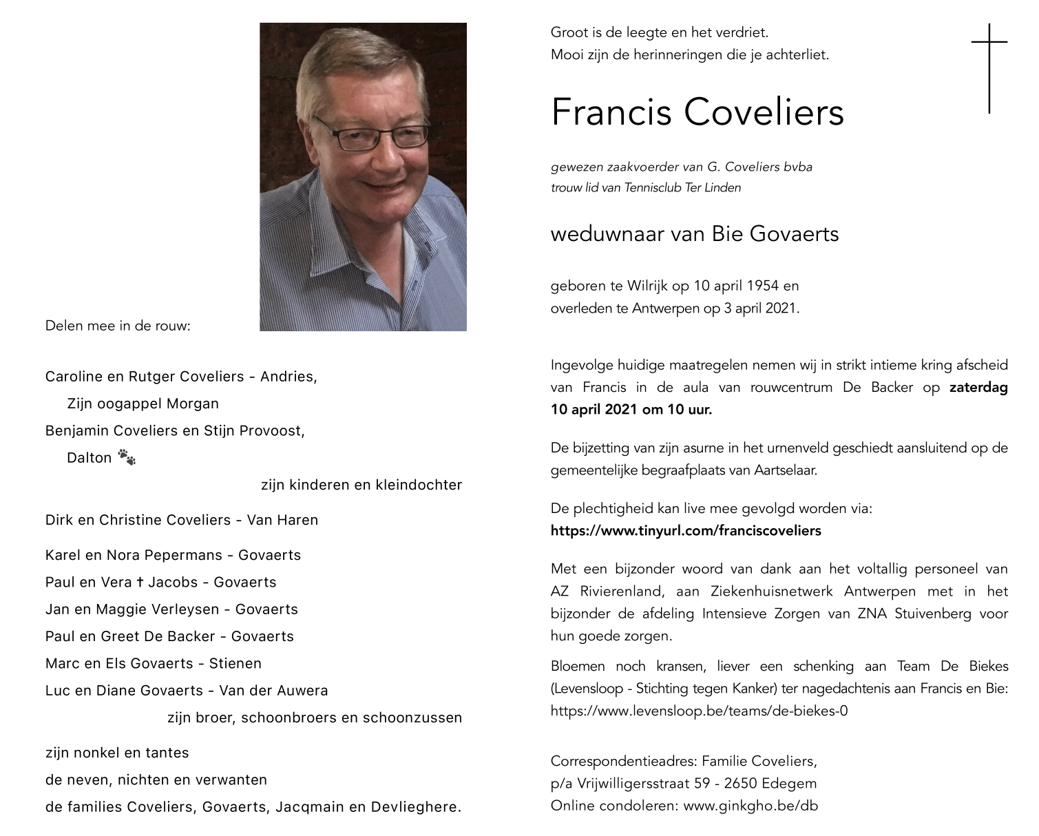 Overleden te Antwerpen (2060) op zaterdag 3 april 2021 op 66-jarige leeftijd