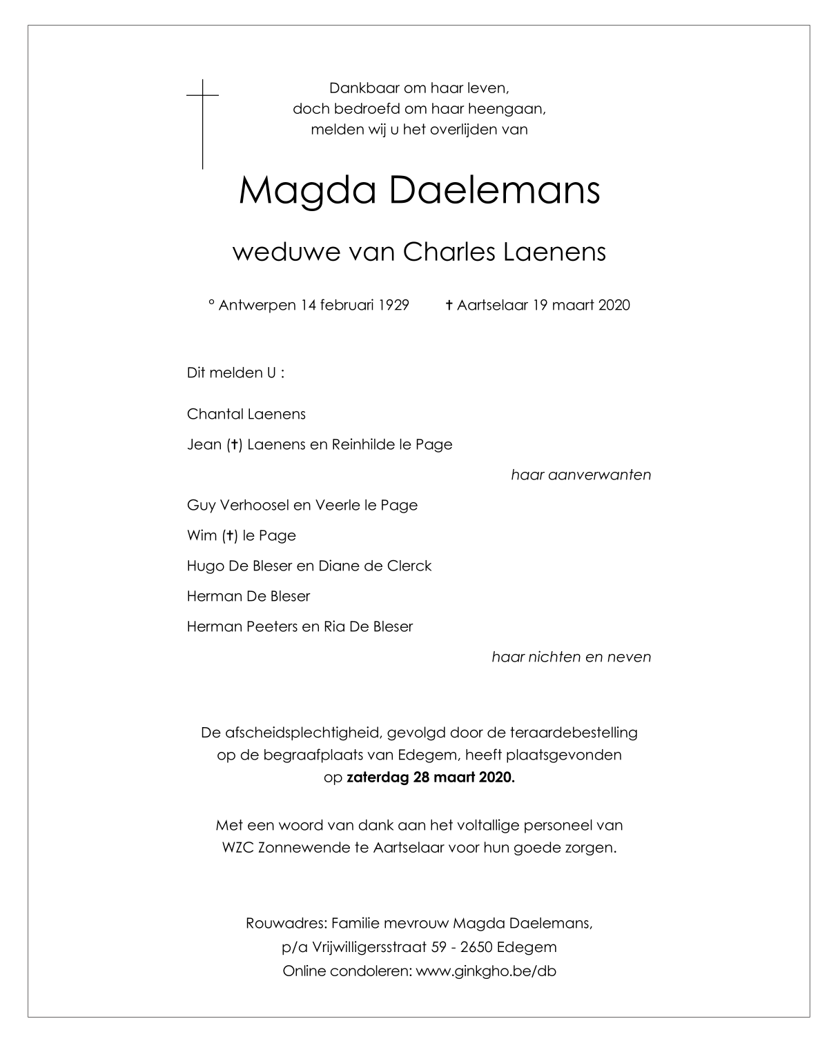 Overleden te Aartselaar (2630) op donderdag 19 maart 2020 op 91-jarige leeftijd