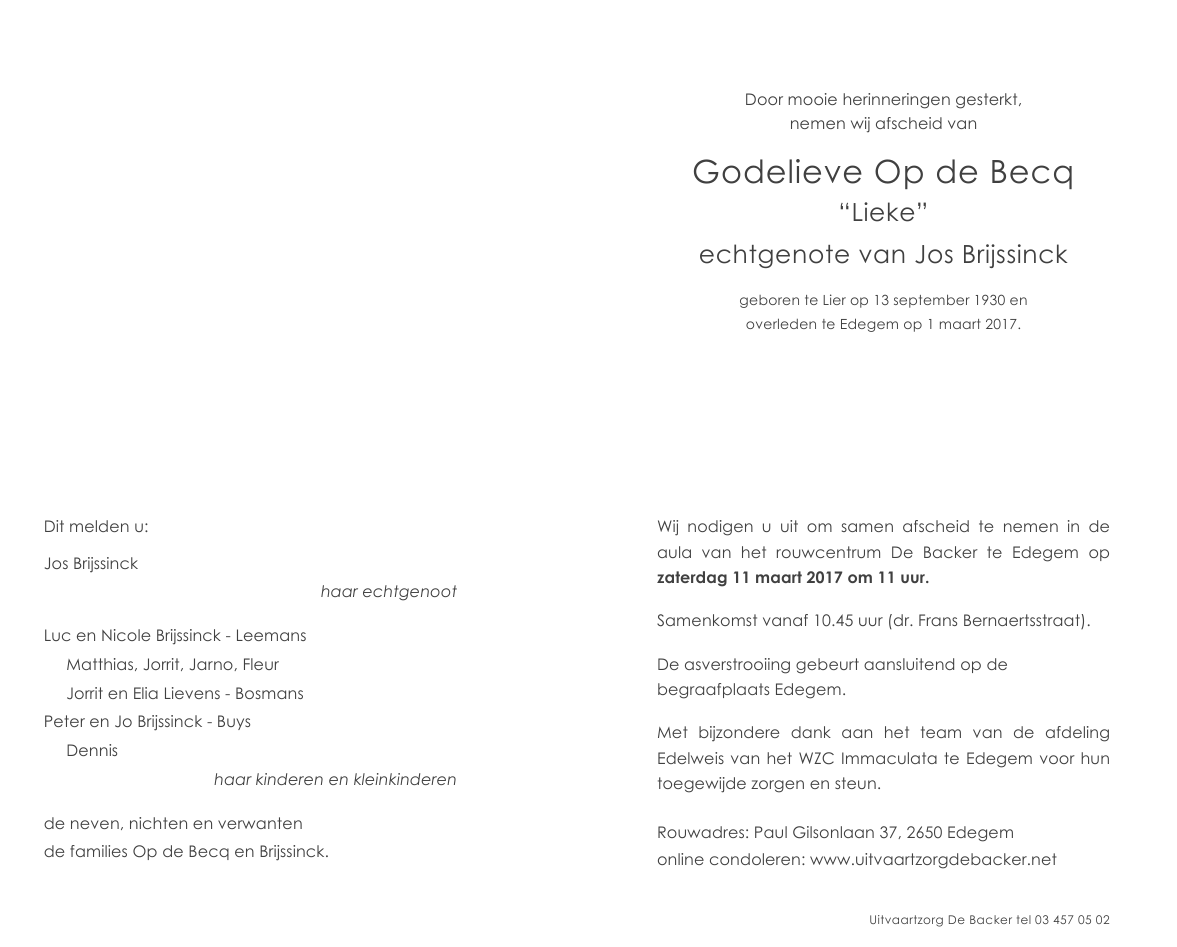 Overleden te Edegem (2650) op woensdag 1 maart 2017 op 86-jarige leeftijd