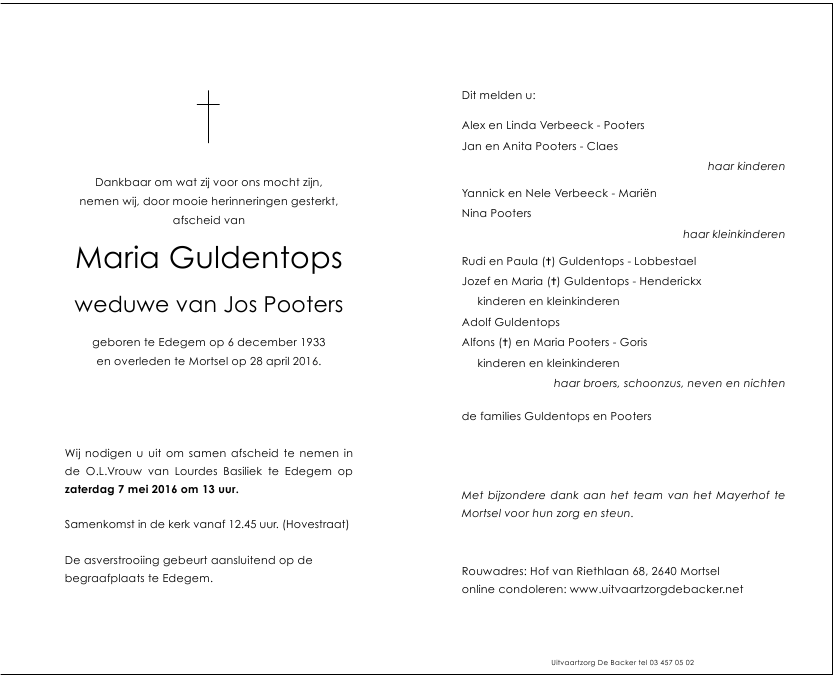 Overleden te Mortsel (2640) op vrijdag 29 april 2016 op 82-jarige leeftijd