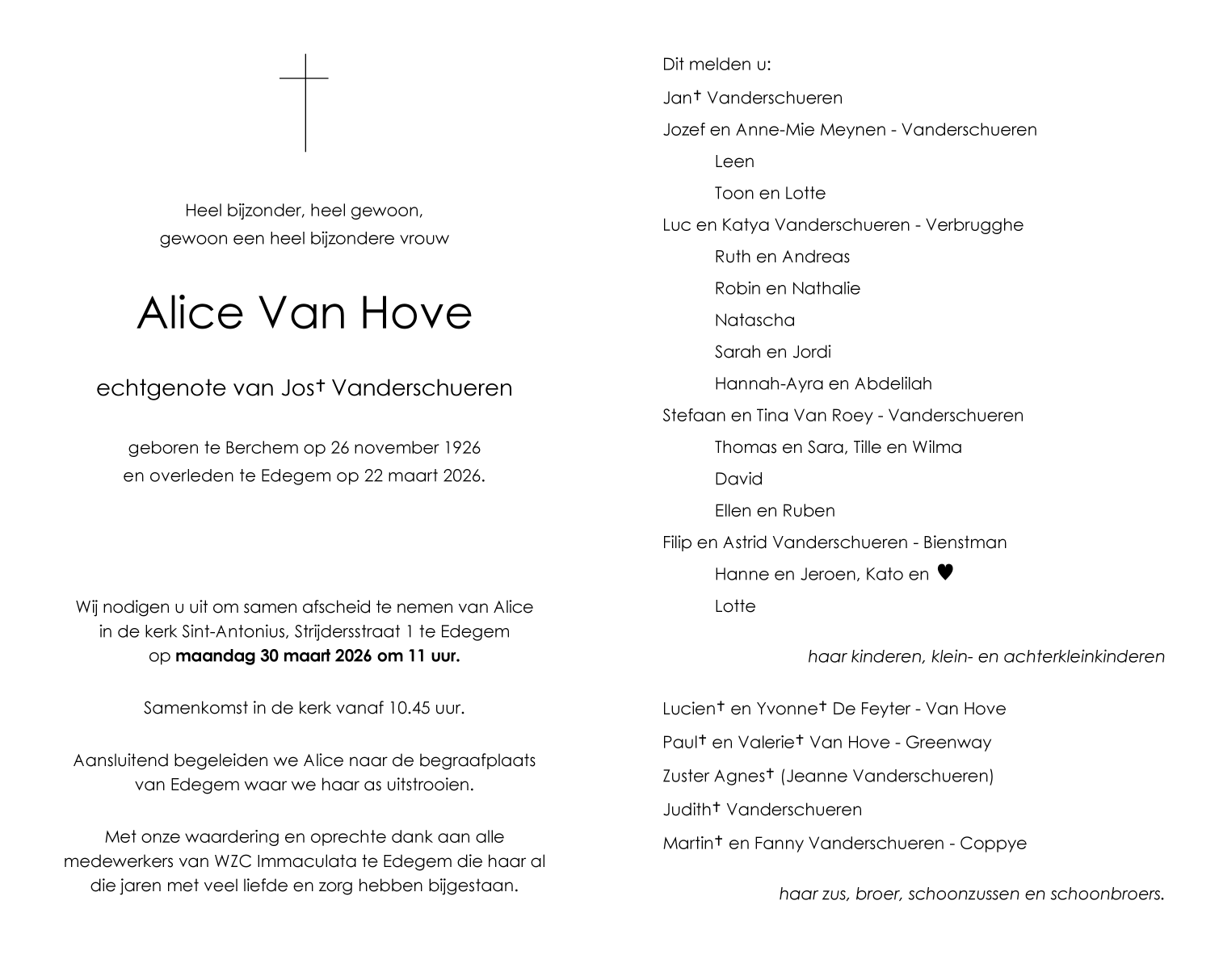 Overleden te Edegem (2650) op zondag 22 maart 2026 op 99-jarige leeftijd