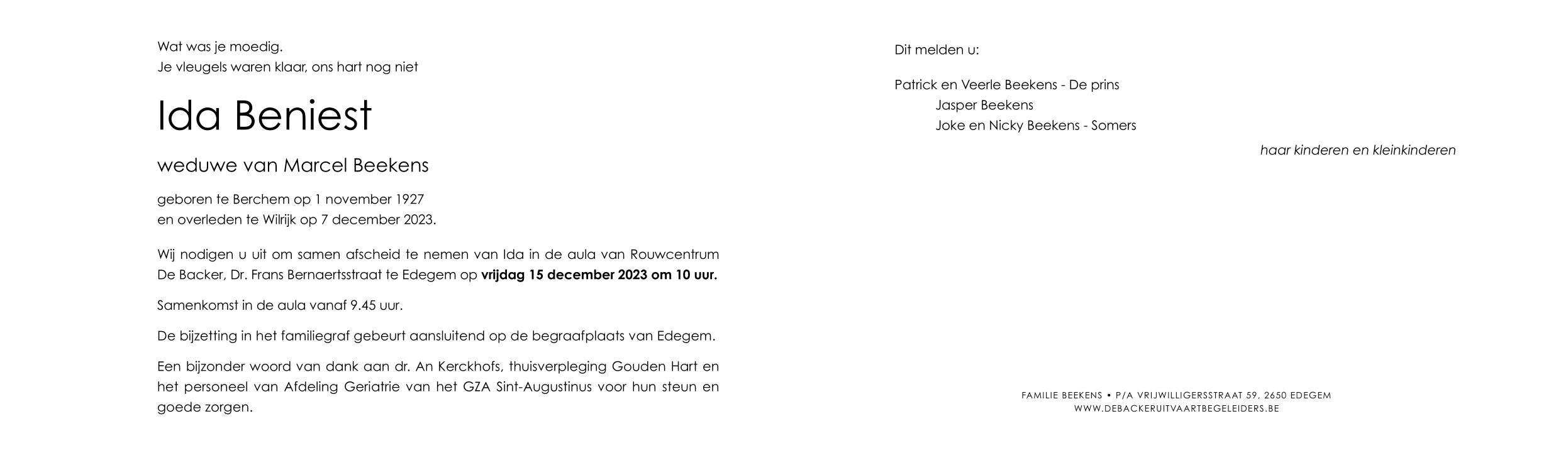 Overleden te Wilrijk (Antwerpen) (2610) op donderdag 7 december 2023 op 96-jarige leeftijd