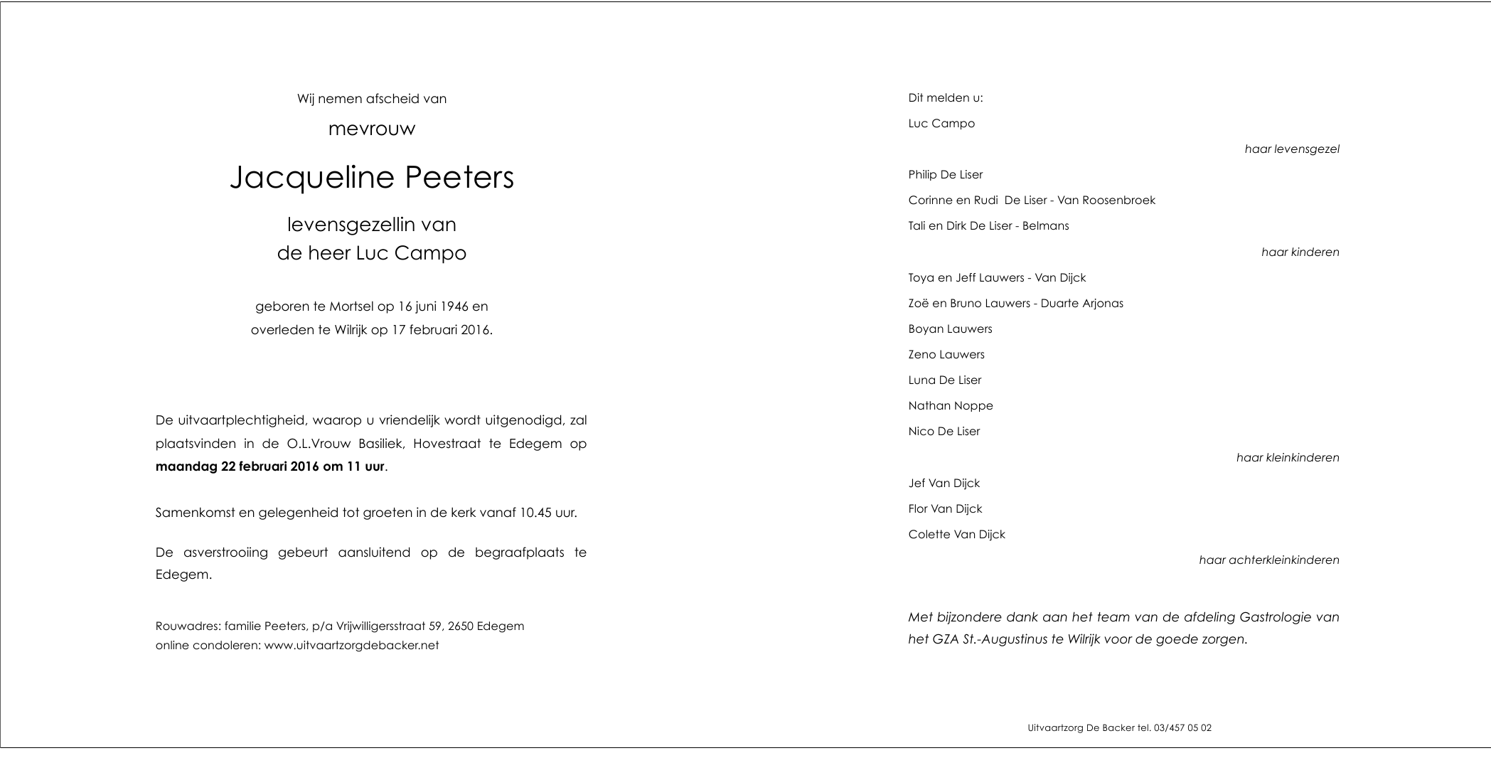 Overleden te Wilrijk (Antwerpen) (2610) op woensdag 17 februari 2016 op 69-jarige leeftijd