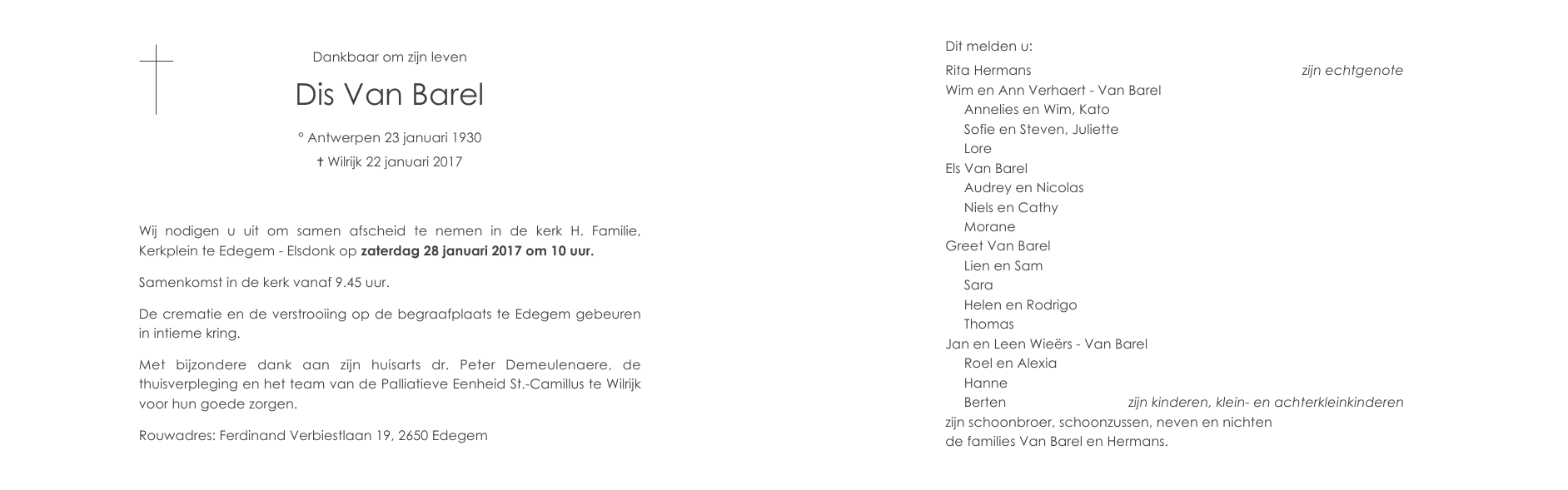 Overleden te Wilrijk (Antwerpen) (2610) op zondag 22 januari 2017 op 86-jarige leeftijd